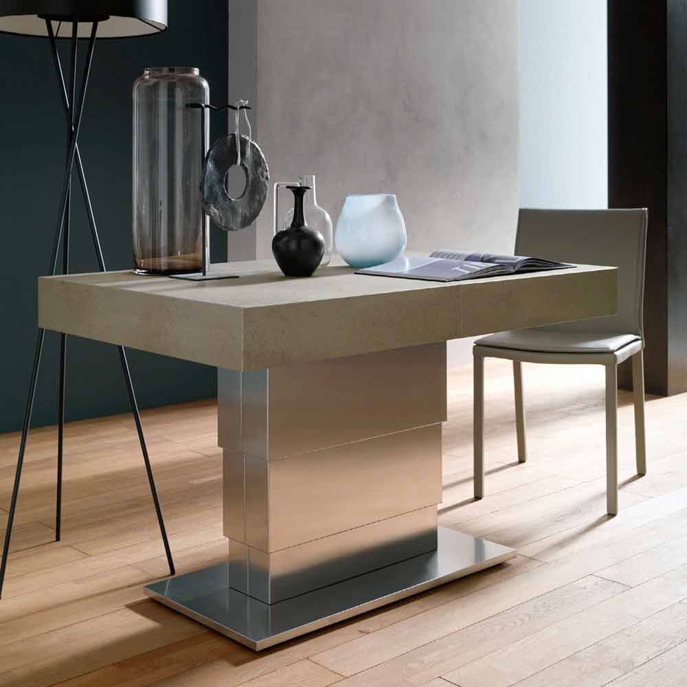 Il piano rettangolare allungabile attraverso quattro allunghe (2 interne e 2 esterne) da 50 cm ciascuna. È capace di trasformarsi in tavolo da pranzo grazie al meccanismo a gas che regola l'altezza al millimetro: da 41 cm a 76 cm.