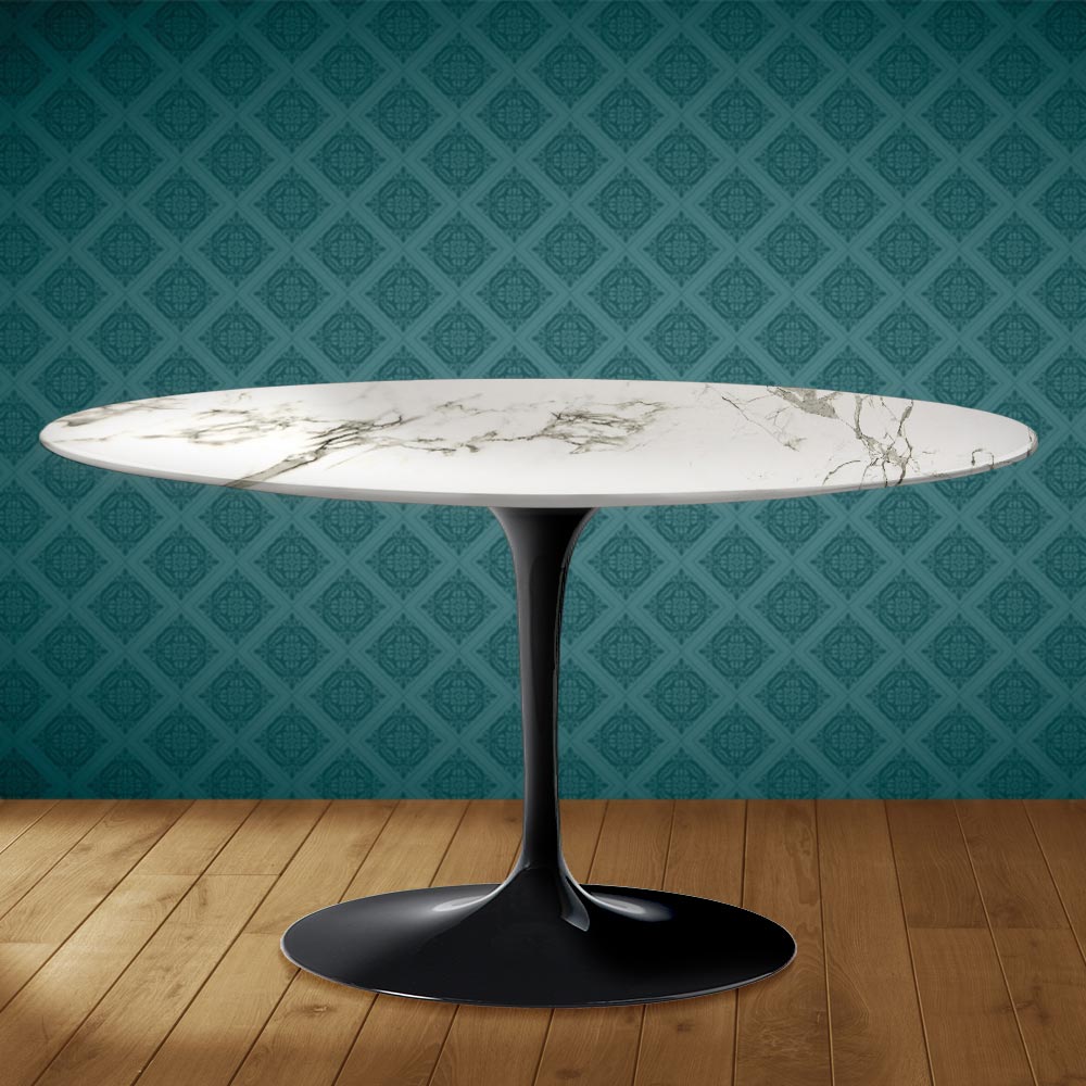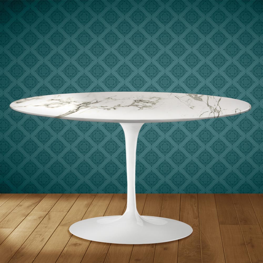 Tavolino da salotto con piano ovale in ceramica aura 22, effetto marmo carrara statuario opaco, e basamento in alluminio lucido interamente realizzato in Italia. Questo complemento d'arredo ha due caratteristiche uniche: la ceramica aura 22 e la forma ovale. La ceramica si contraddistingue per la sua grafica complessa e molto pregiata che riesce a creare un'atmosfera calda e accogliente in qualsiasi ambiente living in cui viene collocata, Questo materiale inoltre è di alta qualità e dotato di notevole resistenza. La particolare forma ovale è sempre più di moda per arredare con originalità le stanze grazie alla linea e alla sua praticità e funzionalità.