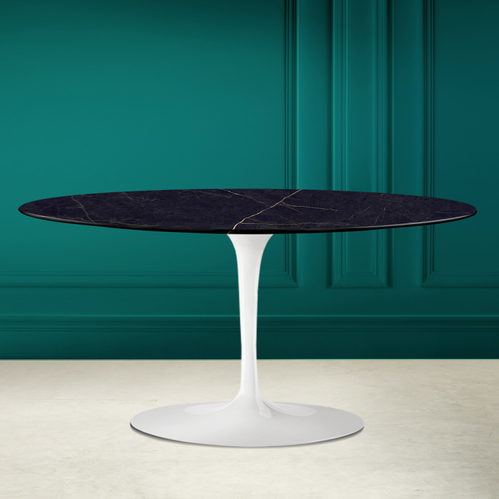 Tavolino da salotto con piano ovale in ceramica noir laurent e basamento in alluminio lucido Made in Italy
