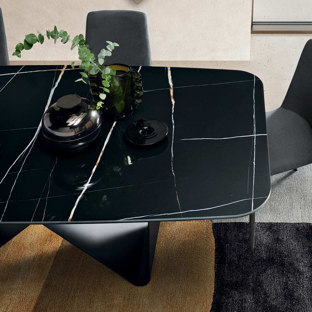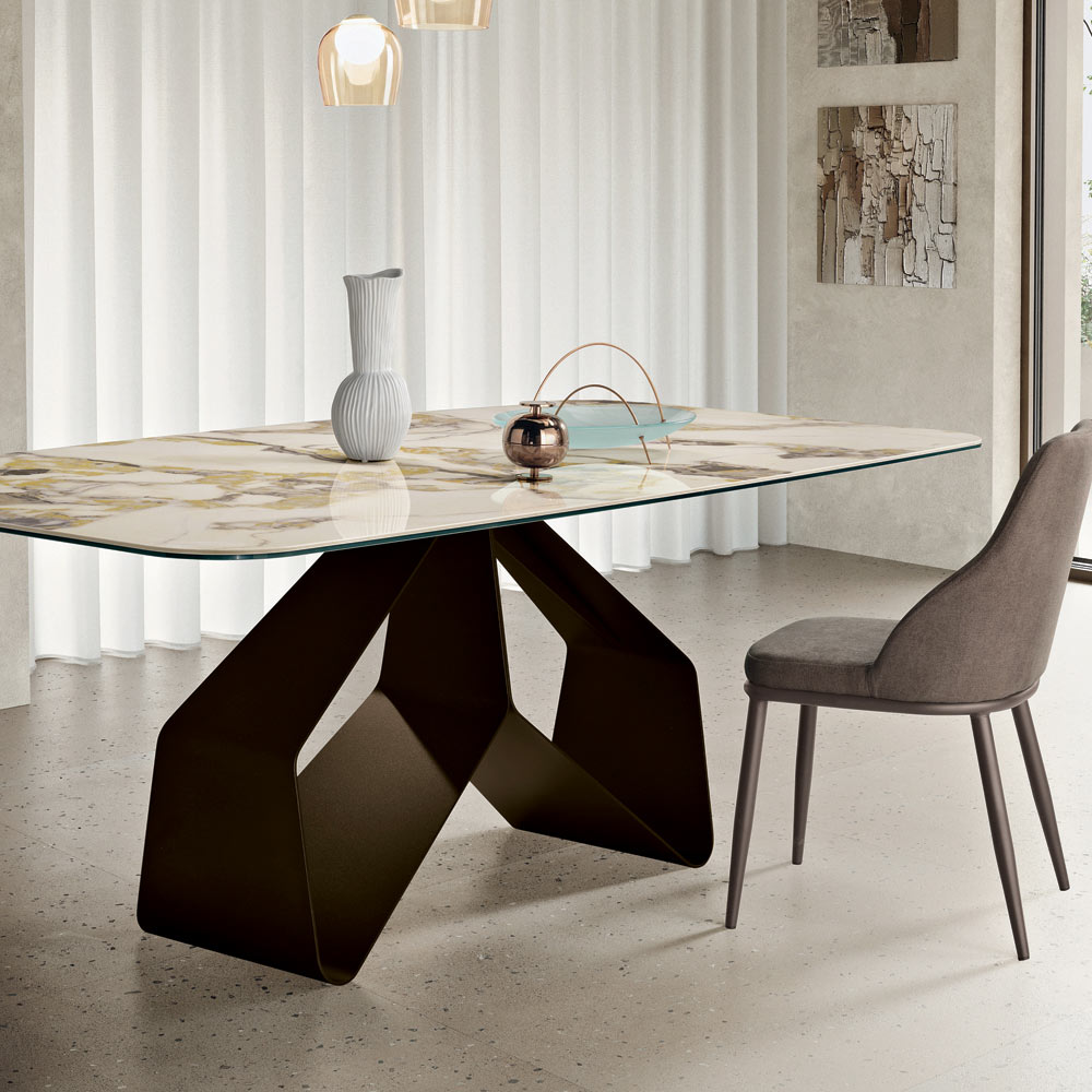 Il piano in ceramica effetto marmo stratificata su vetro riproduce con grande realismo le venature naturali della pietra, offrendo allo stesso tempo una superficie resistente e pratica. La ceramica garantisce infatti elevata resistenza a graffi, calore e macchie, rendendo il tavolo perfetto per l’utilizzo quotidiano.