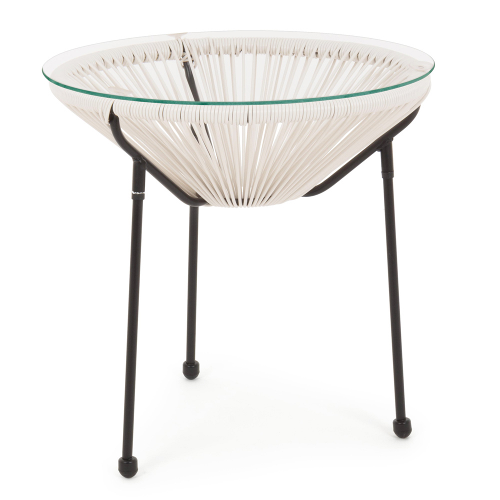 Tavolino di design da esterno realizzato in acciaio, con piano in vetro, articolo da giardino.