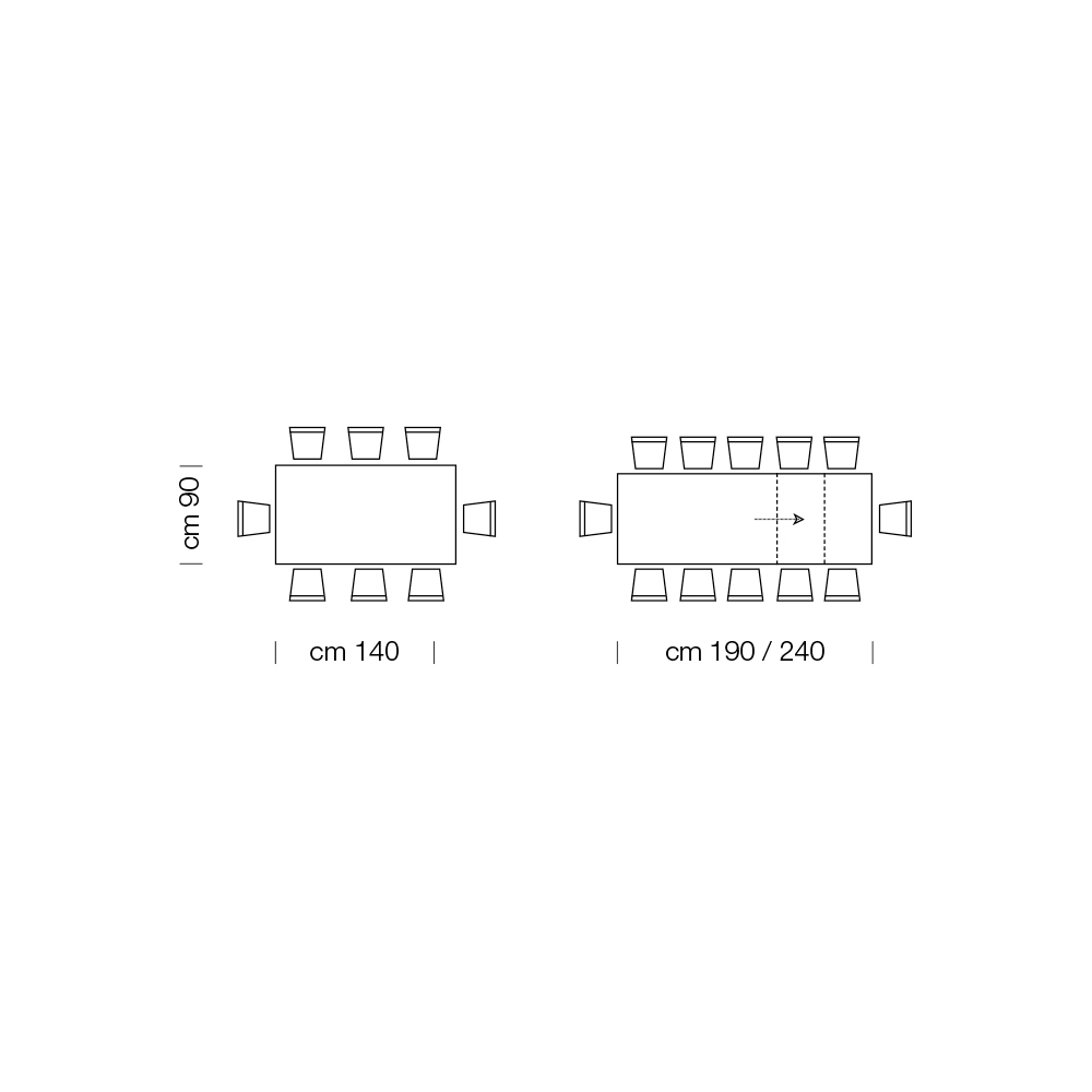 - L 140 (240) x P 90 x H 75 cm 12 posti allungabile con due allunghe da 50cm ciascuna interne;