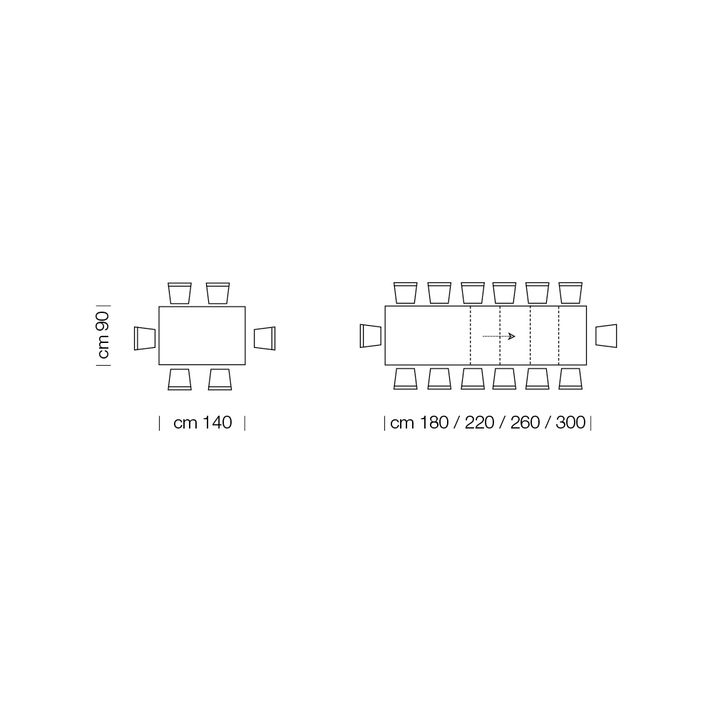 - L 140 (300) x P 90 x H 75 cm 14 posti allungabile con quattro allunghe da 40cm ciascuna interne;