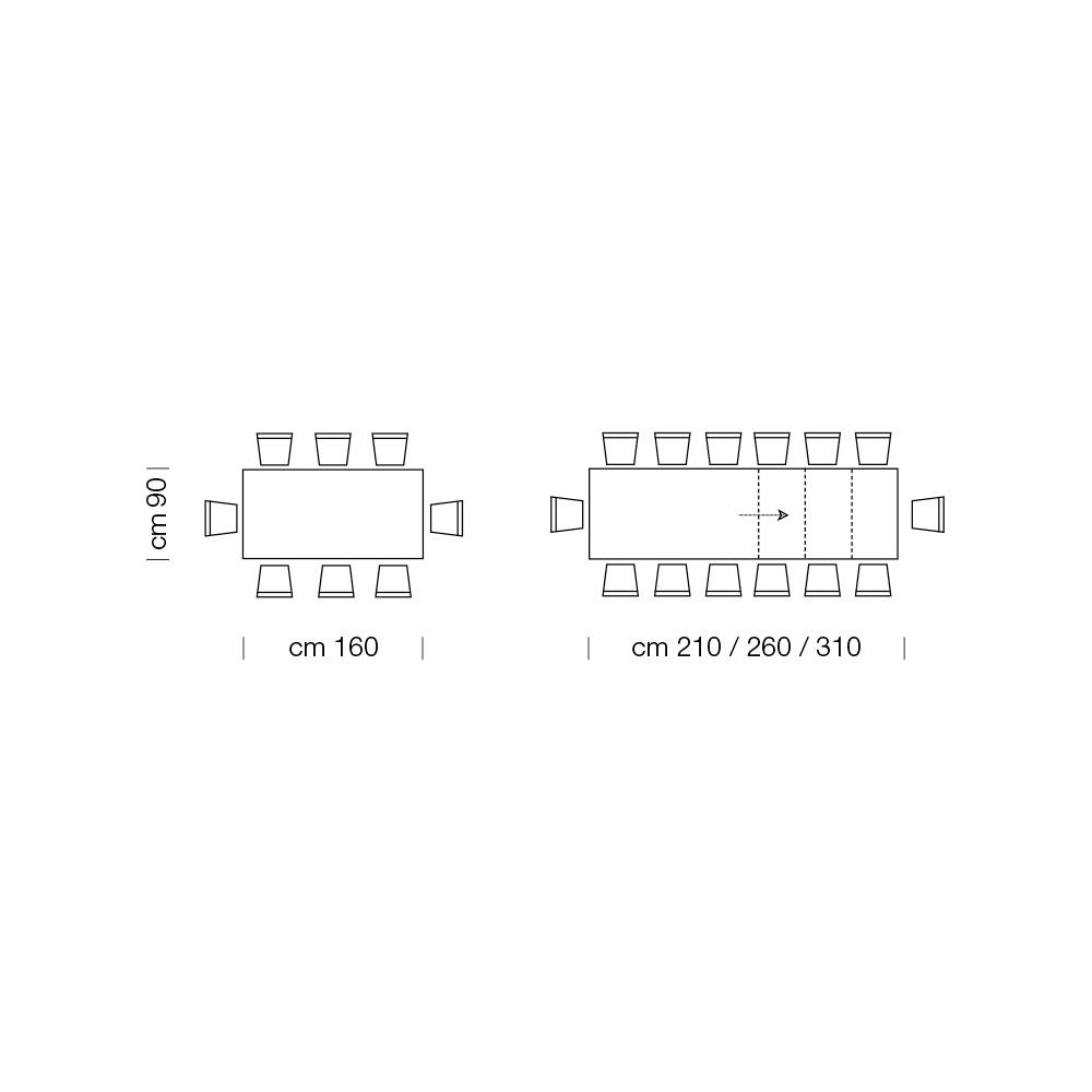 - L 160 (310) x P 90 x H 75 cm 14 posti allungabile con tre allunghe da 50cm ciascuna interne.
