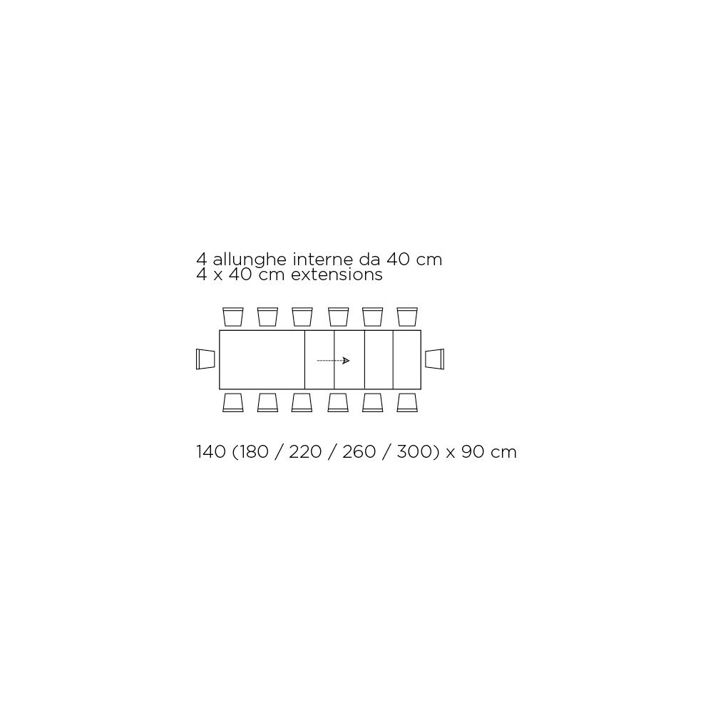 - L 140 (300) x P 90 x H 75 cm 14 posti allungabile con quattro allunghe da 40cm ciascuna interne;