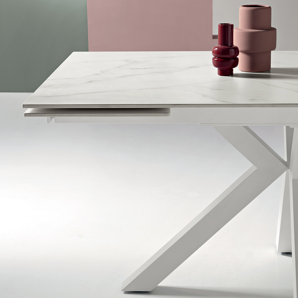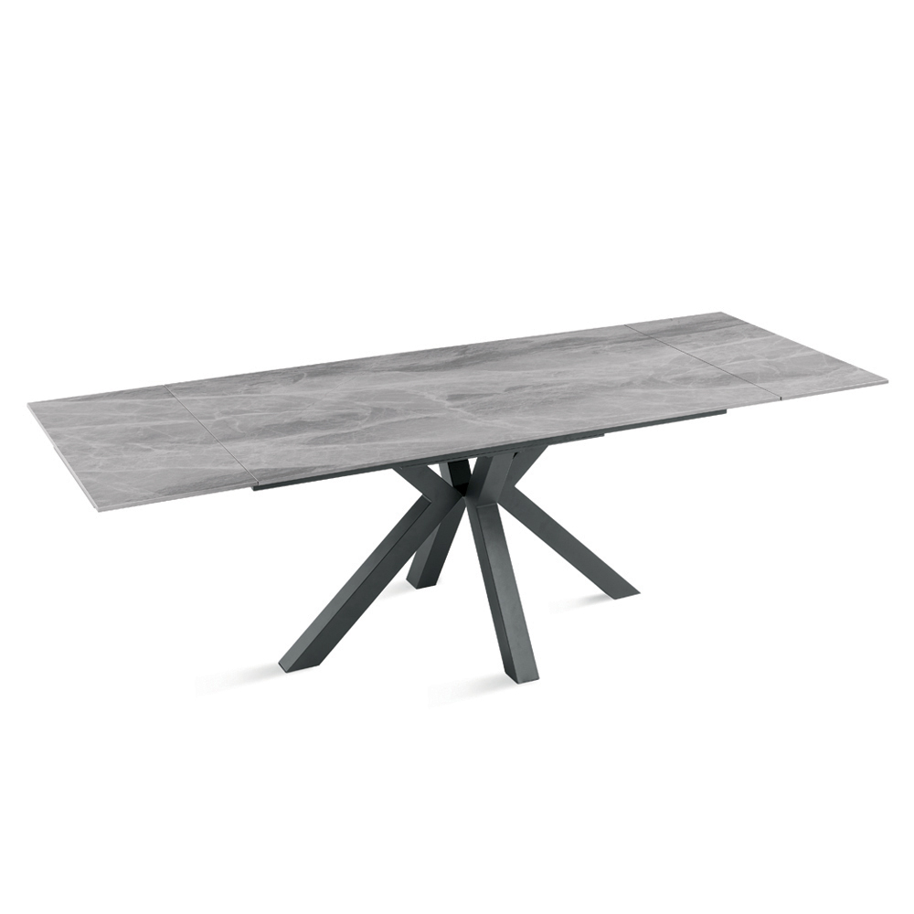 Il tavolo è dotato di due allunghe da 40 cm che permettono di estendere rapidamente il piano, passando da una lunghezza di 160 cm a 240 cm, offrendo così maggiore spazio per accogliere amici e familiari durante pranzi e cene conviviali. La base in metallo verniciato garantisce stabilità e robustezza, completando il design con un tocco contemporaneo ed elegante.