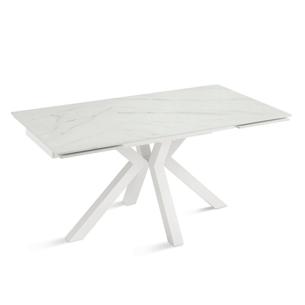 Elegante tavolo da pranzo allungabile dal design moderno, pensato per arredare con stile la zona living o la sala da pranzo. Il piano in pietra sinterizzata effetto marmo unisce estetica raffinata e resistenza, offrendo una superficie durevole e facile da pulire, perfetta per l’utilizzo quotidiano.