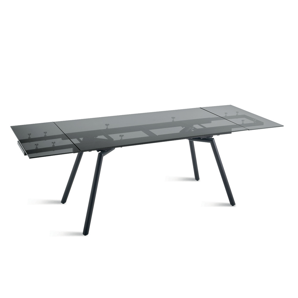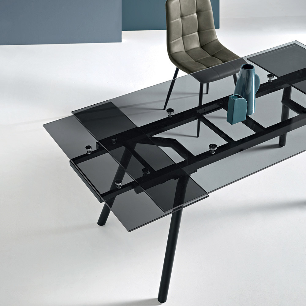 Elegante tavolo da pranzo allungabile dal design moderno, ideale per arredare con stile la sala da pranzo o la zona living. Il piano in vetro fumè dona luminosità e leggerezza visiva all’ambiente, mentre la base in metallo verniciato nero garantisce stabilità e resistenza nel tempo, creando un perfetto equilibrio tra estetica contemporanea e funzionalità.