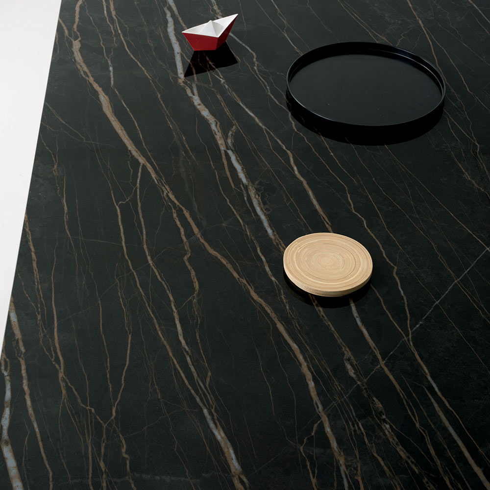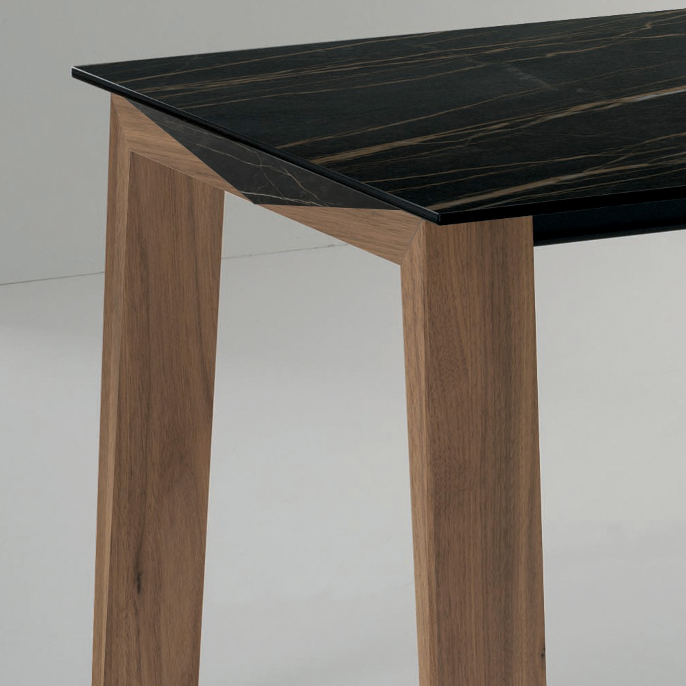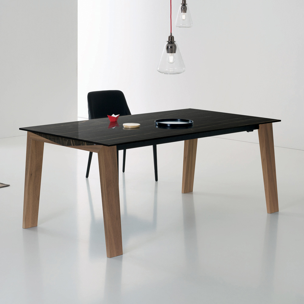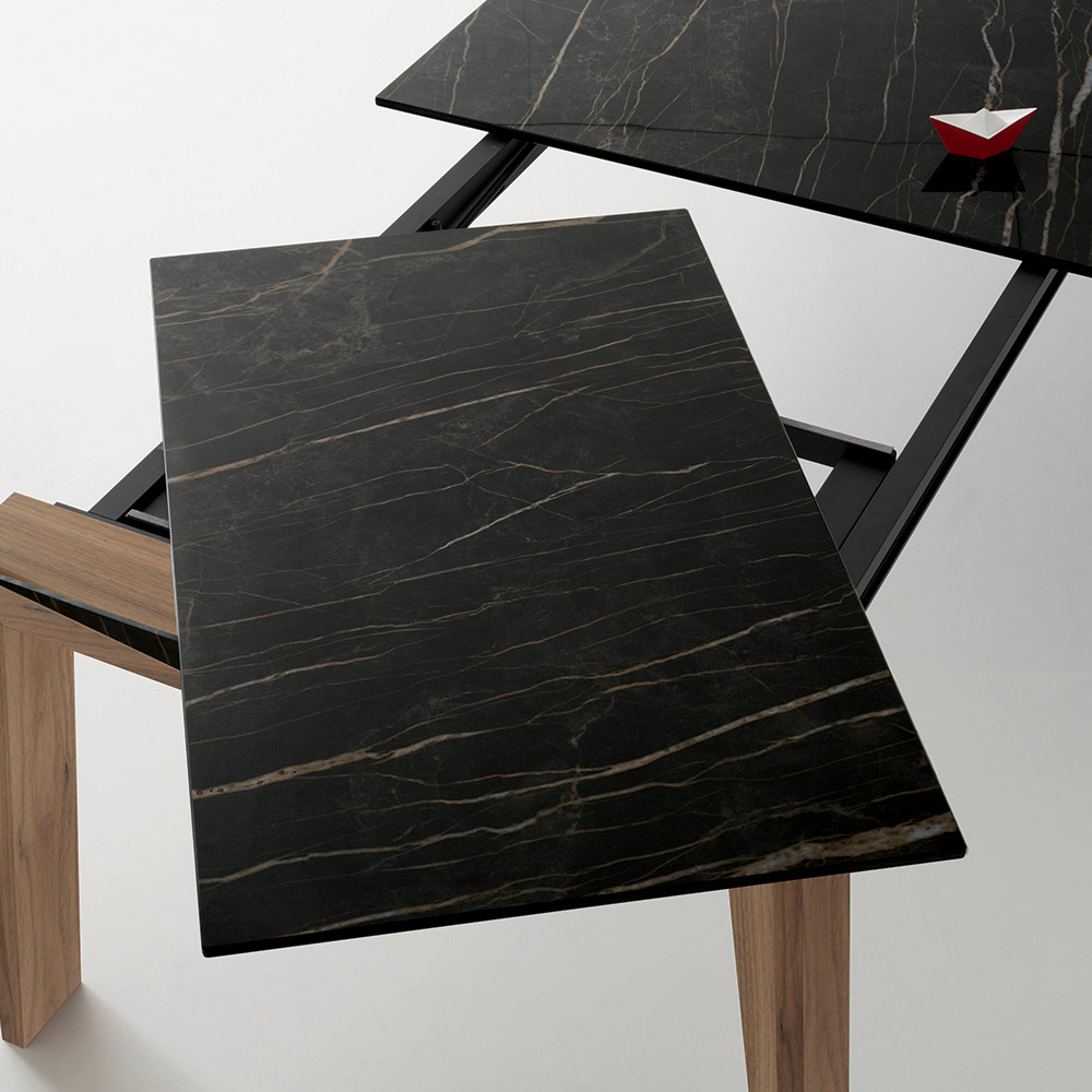 Tavolo allungabile da pranzo in legno massiccio e piano in ceramica lucida, made in Italy.
