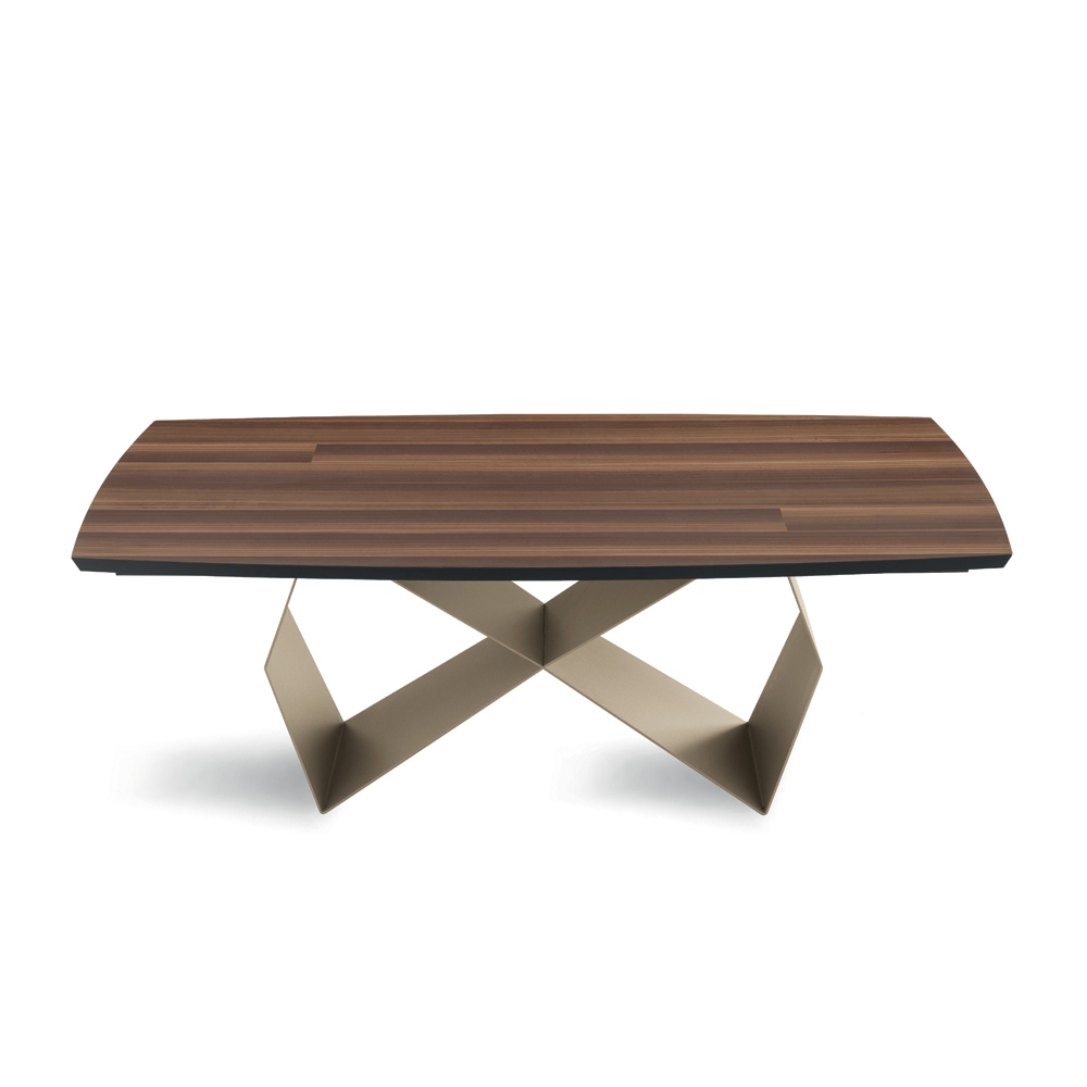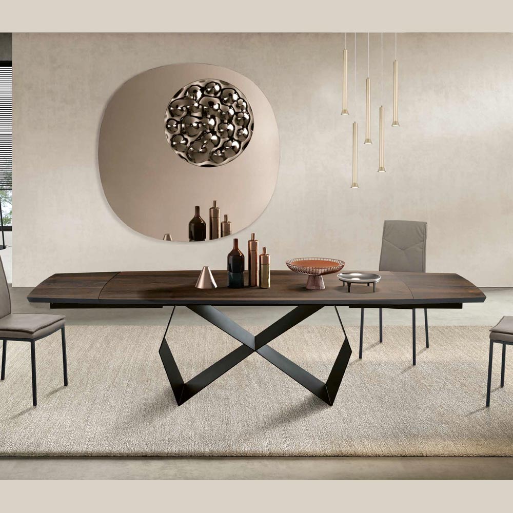 Le gambe in metallo, caratterizzate da una forma geometrica e audace, sono verniciate per contrastare magnificamente con il tono del legno. Questa combinazione di materiali non solo fornisce una solida stabilità ma aggiunge anche un elemento visivo d'impatto, facendo di questo tavolo un vero punto focale in qualsiasi sala da pranzo o area open space.