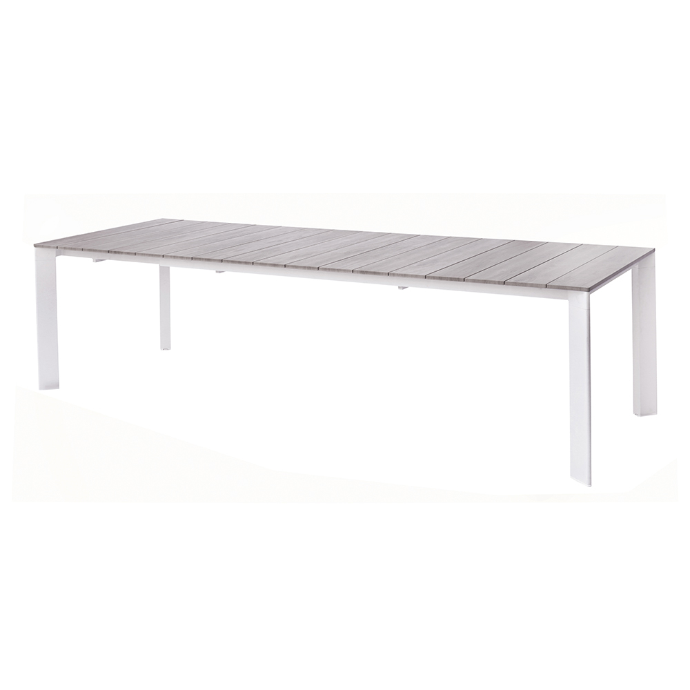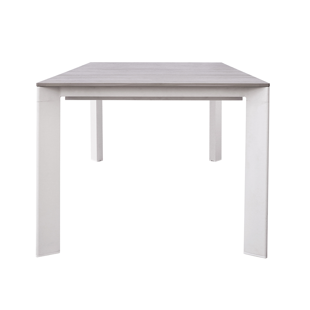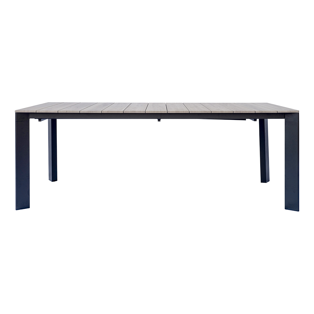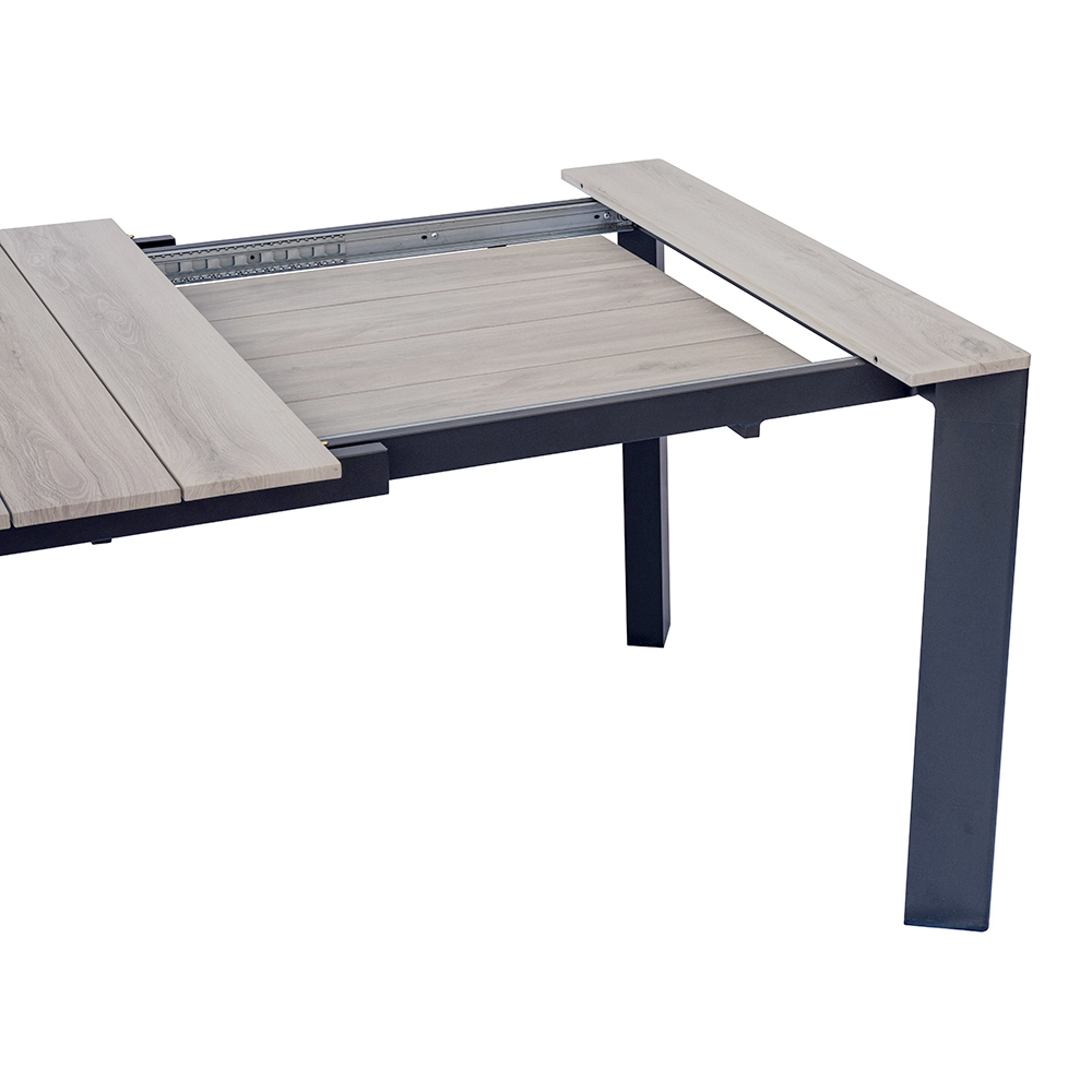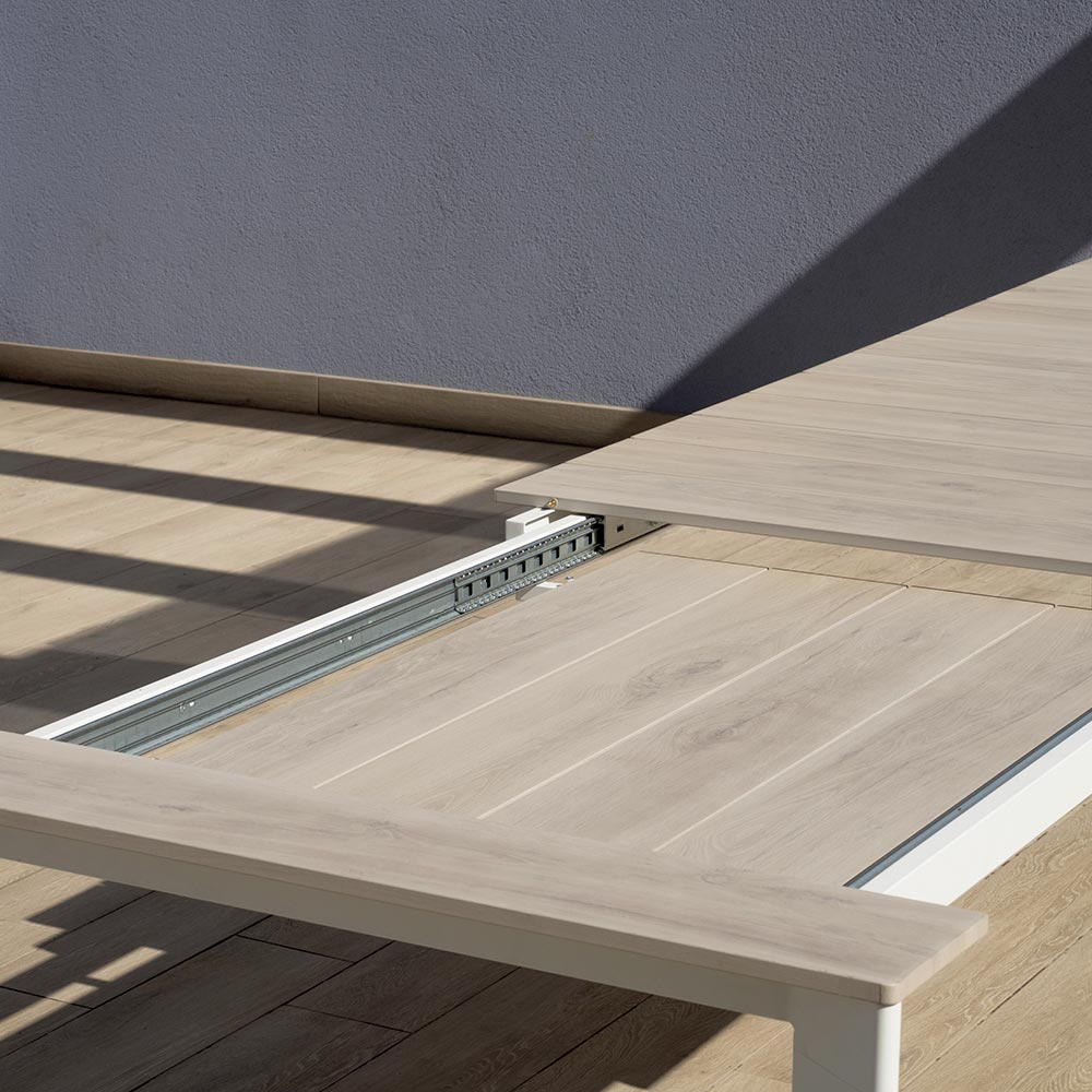Il piano in alluminio effetto legno unisce il calore estetico del legno naturale alla resistenza dell’alluminio, garantendo una superficie elegante, duratura e di facile manutenzione. Il sistema di allungo con gambe scorrevoli in alluminio consente di estendere il tavolo in modo semplice e fluido, mantenendo sempre la massima stabilità e un aspetto armonioso.