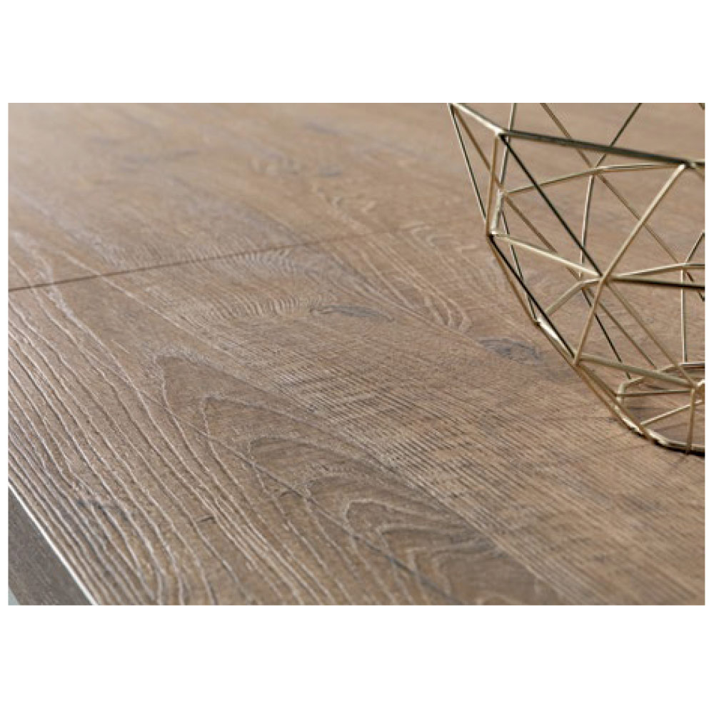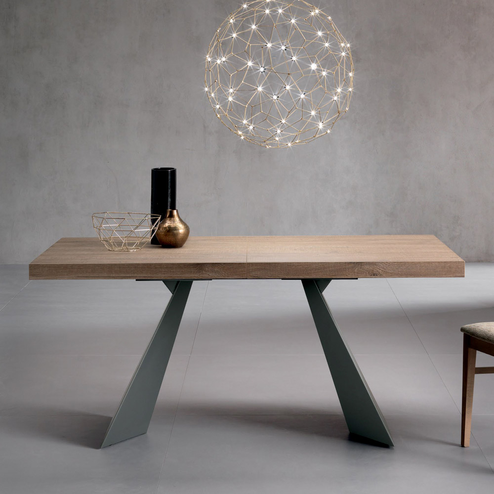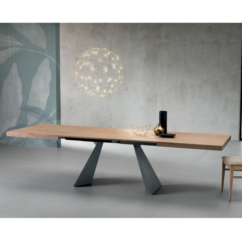 Questo tavolo unisce creatività architettonica e raffinatezza contemporanea, trasformando ogni ambiente in uno spazio di stile. Il piano in laminato finitura tavolato quercia esprime tutta la bellezza delle venature naturali.
