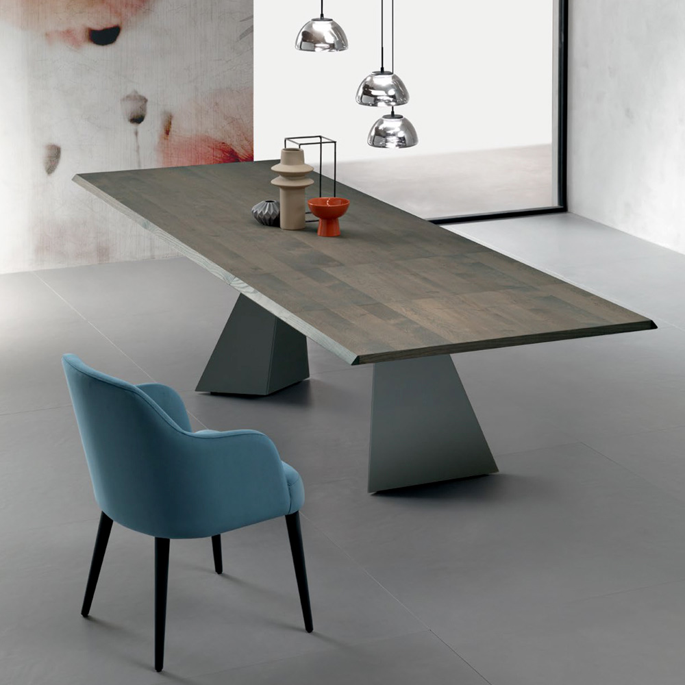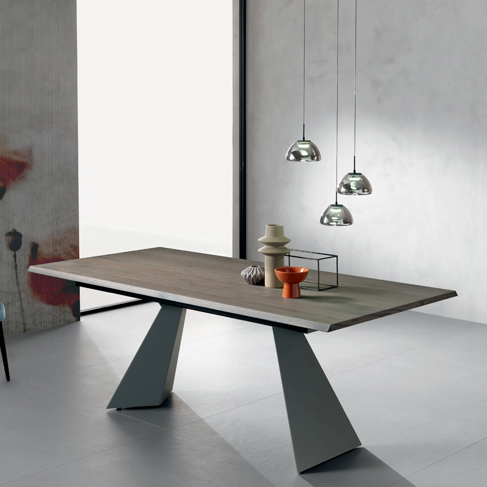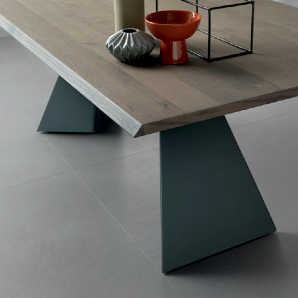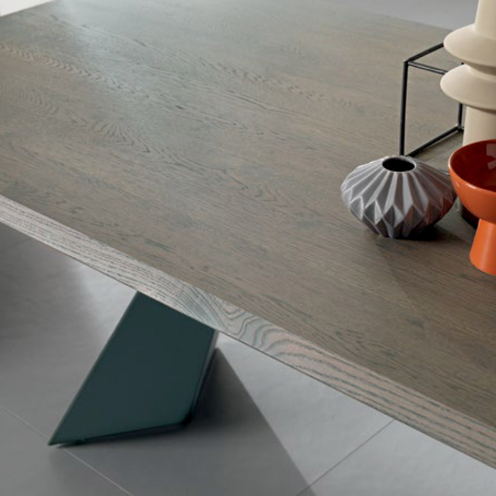 Questo tavolo unisce creatività architettonica e raffinatezza contemporanea, trasformando ogni ambiente in uno spazio di stile. Il piano in legno impiallacciato rovere esprime tutta la bellezza delle venature naturali, mentre il bordo sottile e leggermente inclinato dona leggerezza visiva e un tocco di modernità.