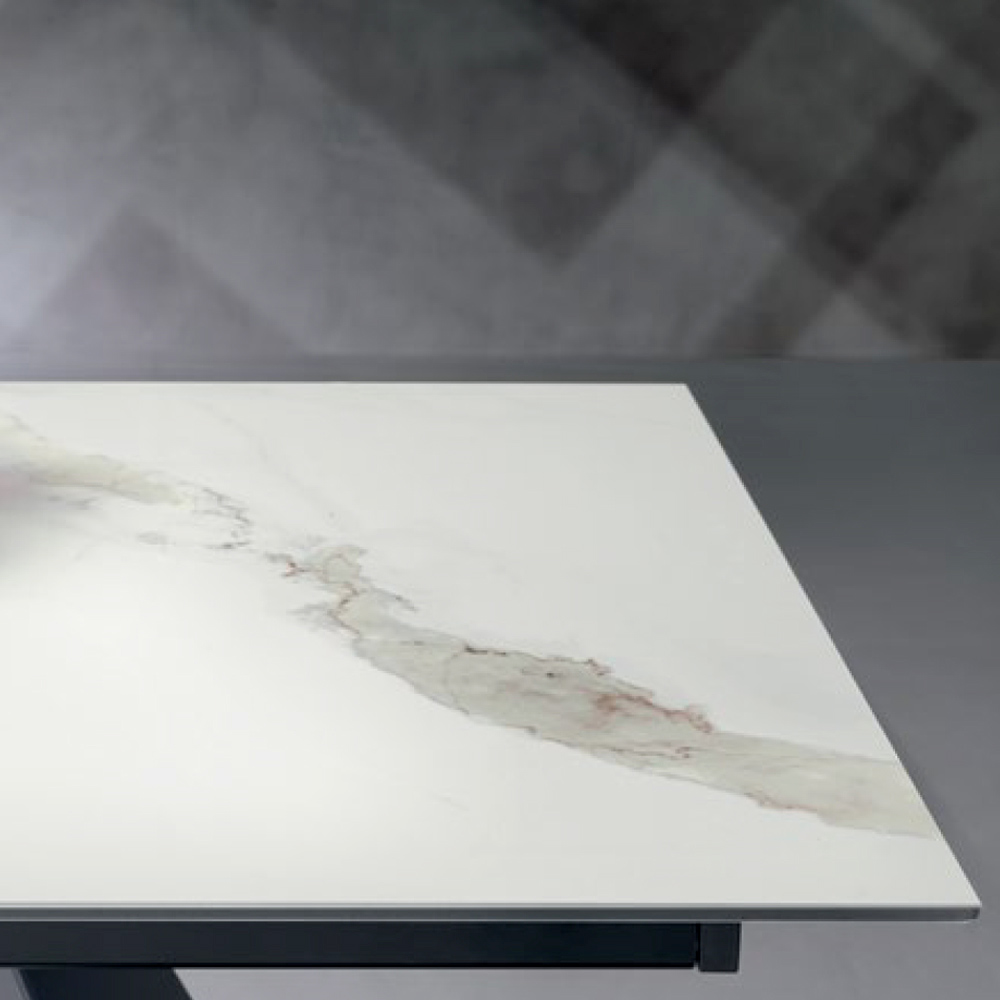 Questo tavolo unisce creatività architettonica e raffinatezza contemporanea, trasformando ogni ambiente in uno spazio di stile. Il piano in vetroceramica finitura calacatta oro lucido (spessore 10 mm) esprime tutta la bellezza delle venature naturali, mentre il bordo sottile e leggermente inclinato dona leggerezza visiva e un tocco di modernità.