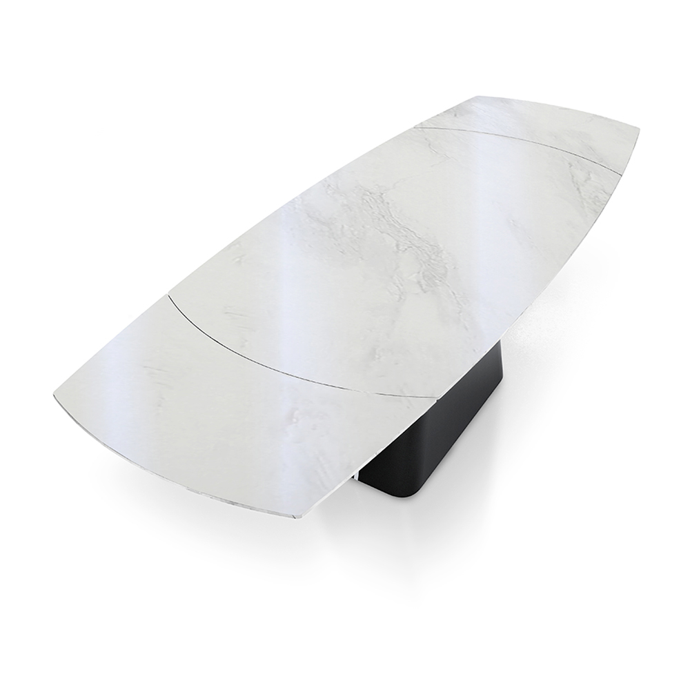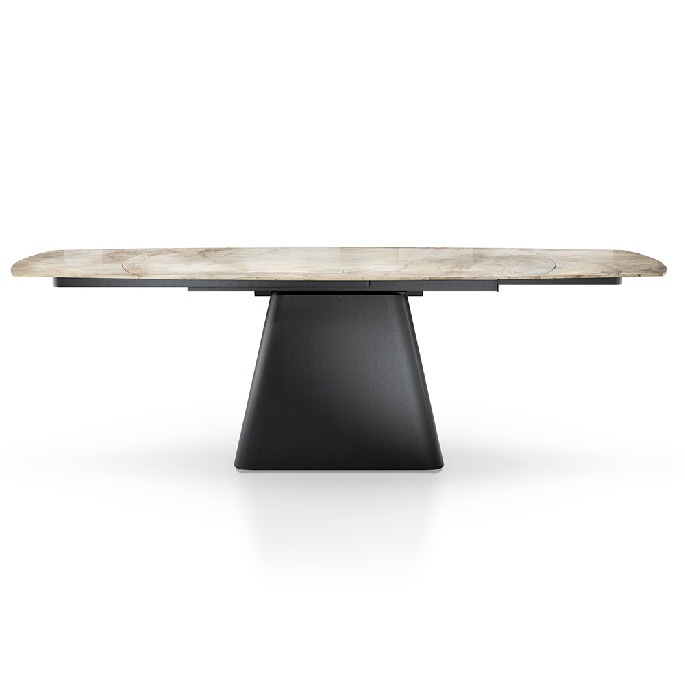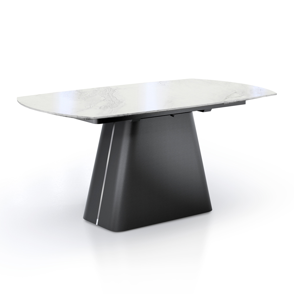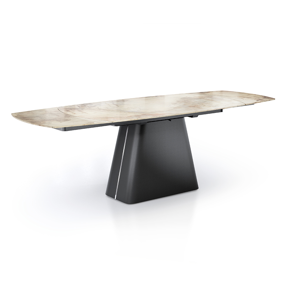 Questo tavolo allungabile è un capolavoro di design e funzionalità, ideale per chi desidera unire eleganza e versatilità in un unico pezzo di arredamento. La superficie si posa su una base in metallo nero robusto e stilisticamente audace, offrendo un contrasto visivo straordinario che cattura l'attenzione in ogni sala da pranzo.