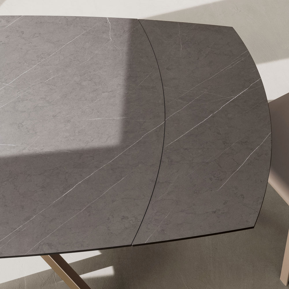 Il piano in HPL è elegante resistente. Grazie al meccanismo di allunga, il tavolo si estende in modo semplice e fluido, passando da una forma compatta a una più ampia, perfetta per accogliere ospiti con comfort.