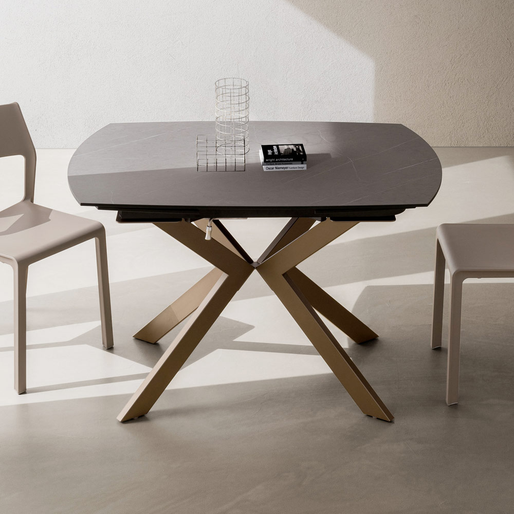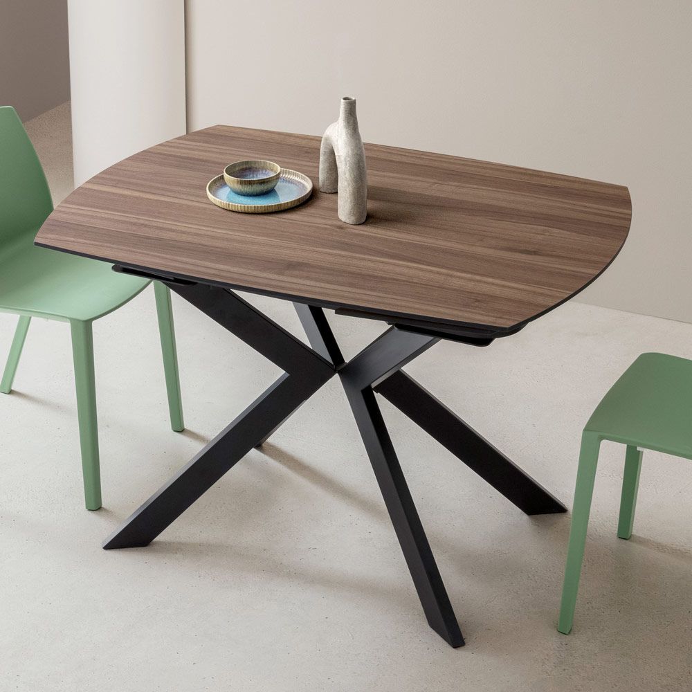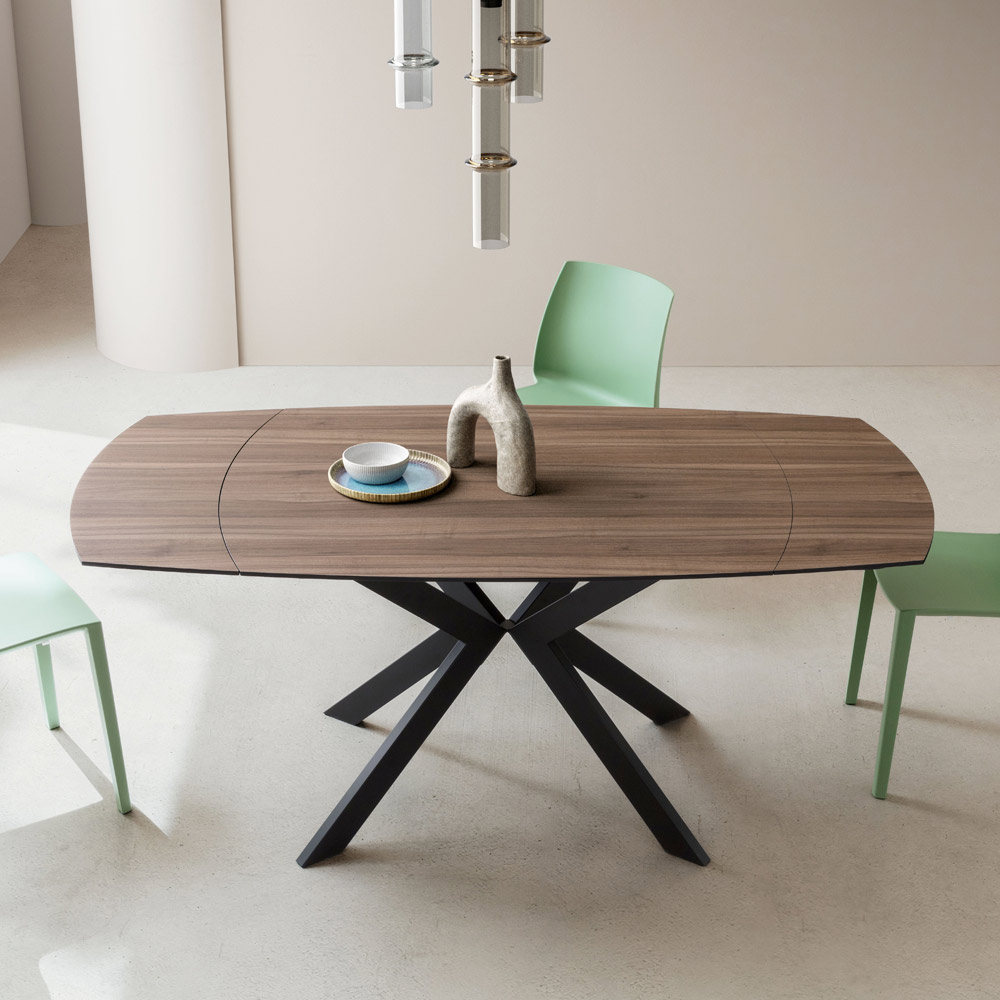 La base in metallo verniciato, con gambe incrociate a stella, dona solidità e carattere, trasformando il tavolo in un vero protagonista dello spazio.