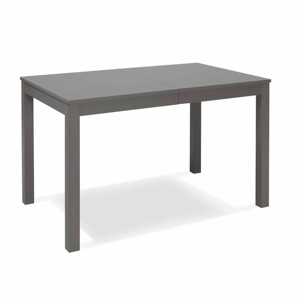 Tavolo da pranzo allungabile con gambe in legno di faggio massello color grigio chiaro. Top, fasce e allunghe in melaminico color grigio chiaro. Le allunghe sono inserite nel tavolo.
