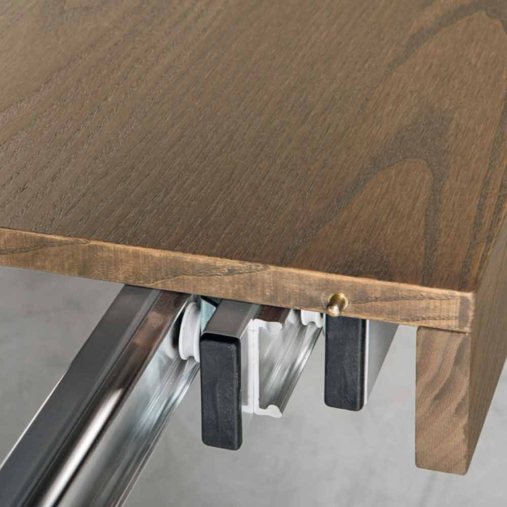 gamba in legno massello di frassino dotato di ruote con telaio in metallo verniciato a scorrimento laterale; al suo interno alloggiano 3 allunghe da 60 cm ciascuna.