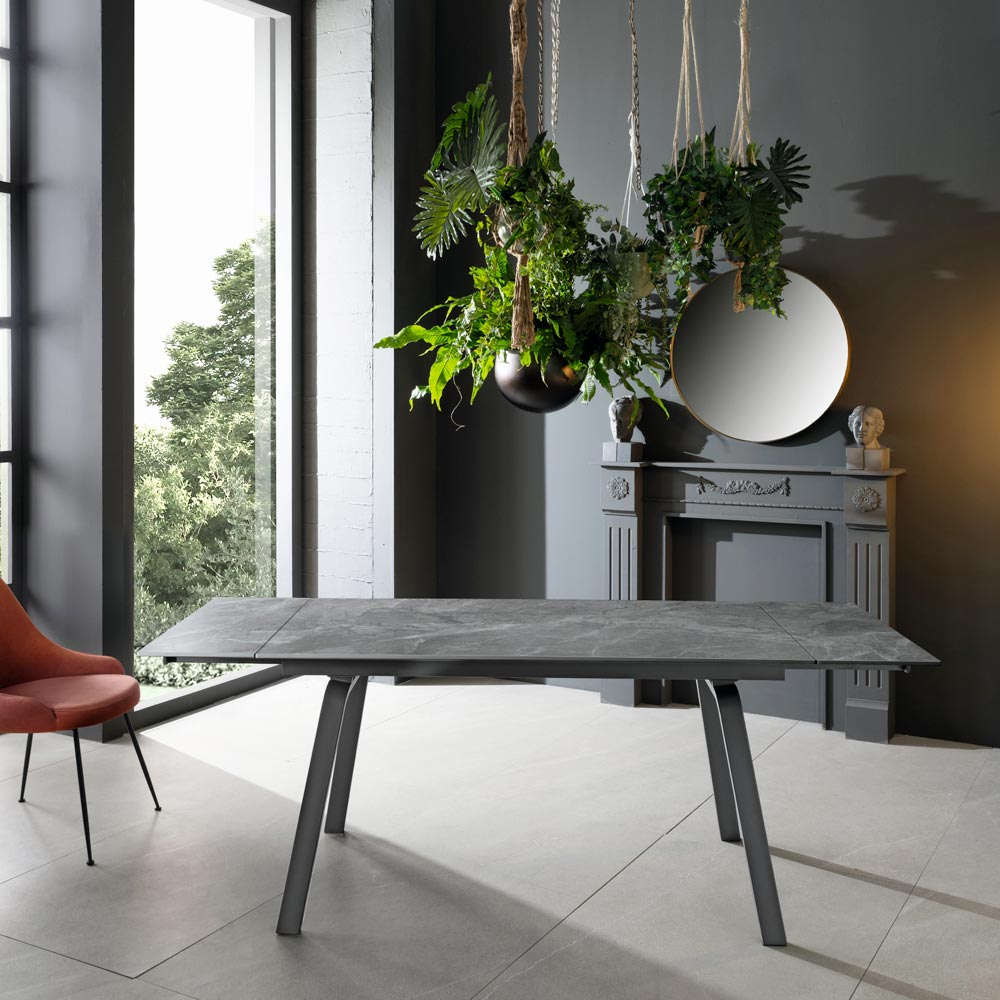 A catturare l’attenzione è la forza espressiva di questo tavolo allungabile in stile contemporaneo e industrial. Il suo design è caratterizzato dall’elegante top realizzato in pietra sinterizzata che si abbina con gusto alla solida base in metallo. Offre tante possibili combinazioni tra le finiture del piano rettangolare e le finiture della base, assecondando l’espressione e il gusto personale e riflettendo lo spirito del contesto in cui viene inserito. Grazie alla sua estensibilità riesce a diventare l’alleato perfetto nella creazione degli spazi conviviali unici e calorosi.