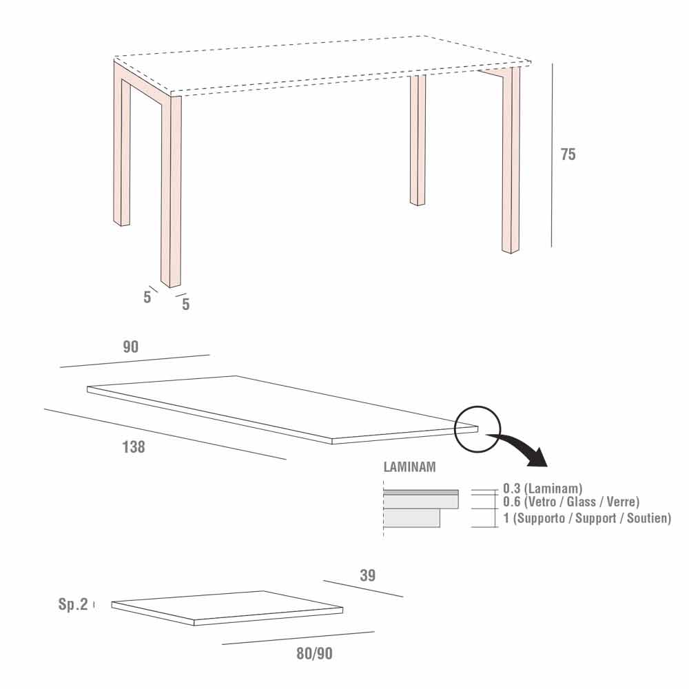 laminam (sp. 3 mm) supportato da uno strato in vetro (sp. 6mm) e da un pannello da 12mm, struttura in