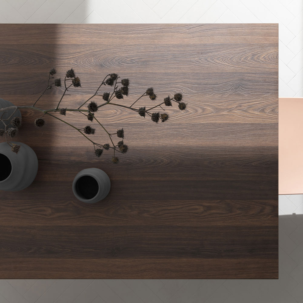 NB: la base e il piano del tavolo sono disponibili in una vasta gamma di finiture differenti. Non si garantisce la continuità della venatura tra piano e allunga