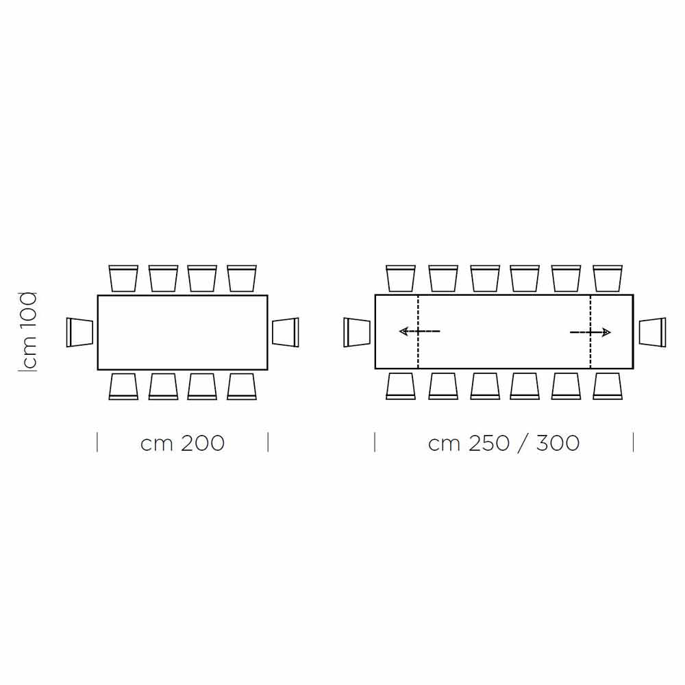 - L 200/300 x P 100 x H 75,5 cm 14 posti (2 allunghe da 50 cm).