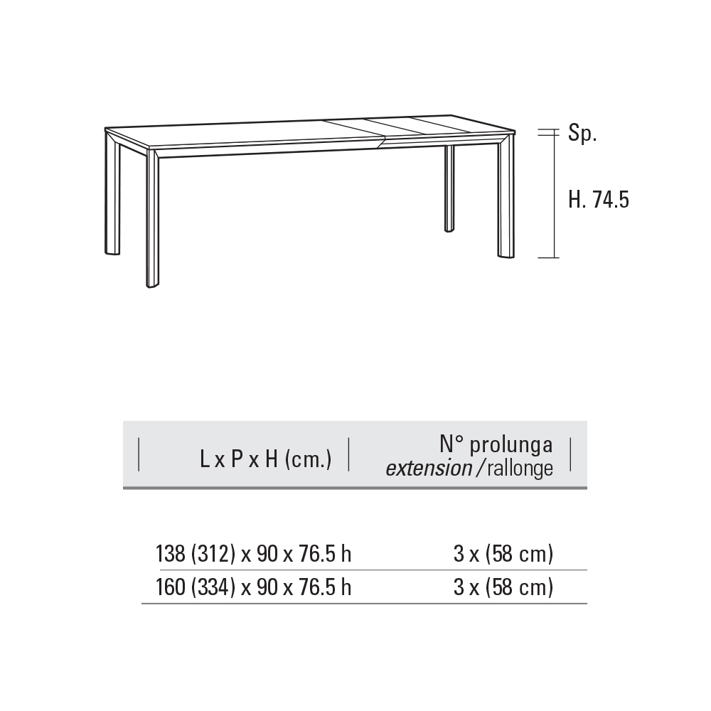 NB: la base e il piano del tavolo sono disponibili in una vasta gamma di finiture differenti. Non si garantisce la continuità della venatura tra piano e allunga