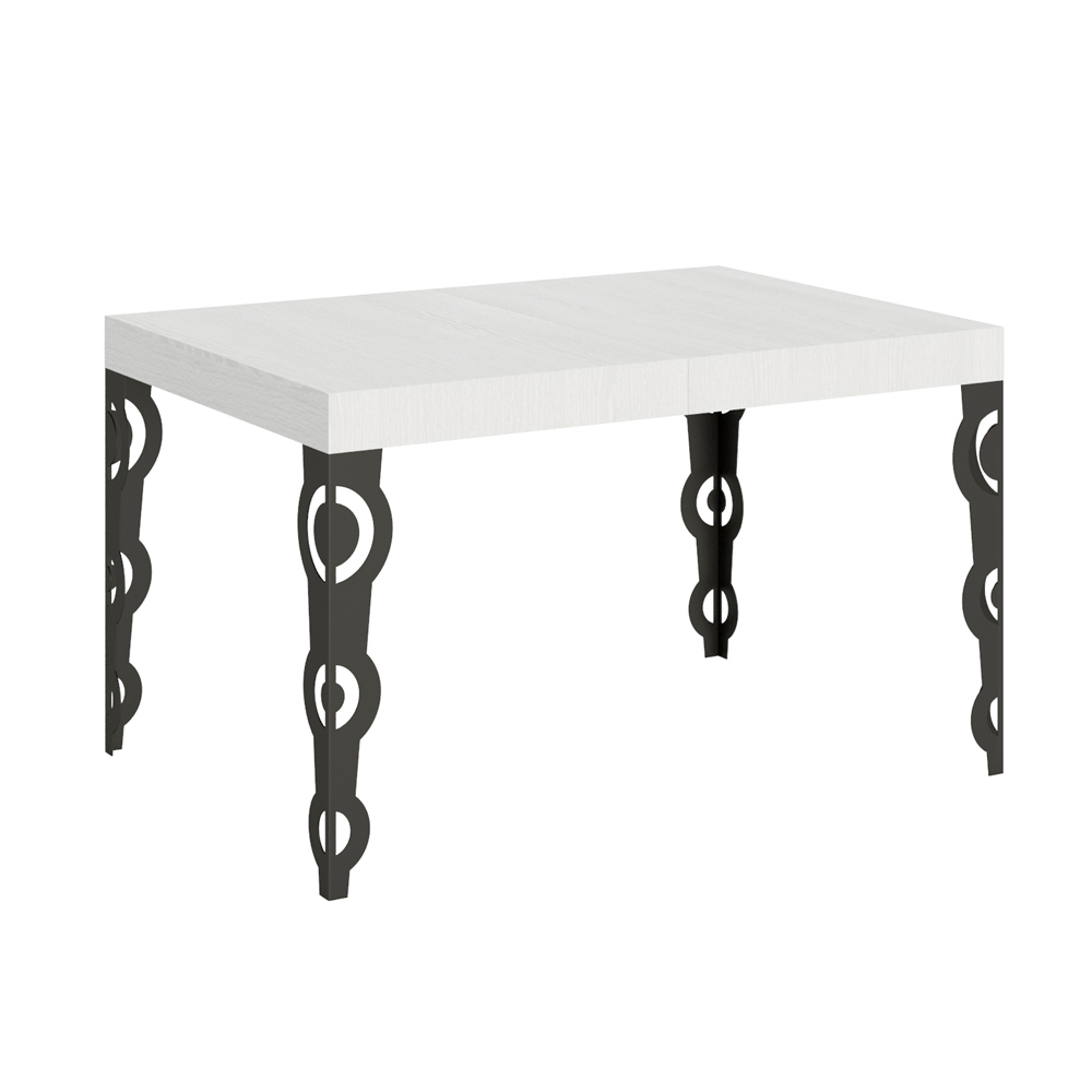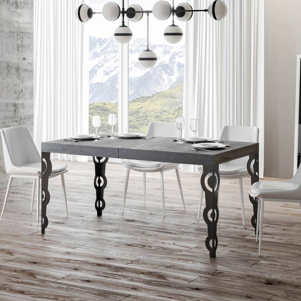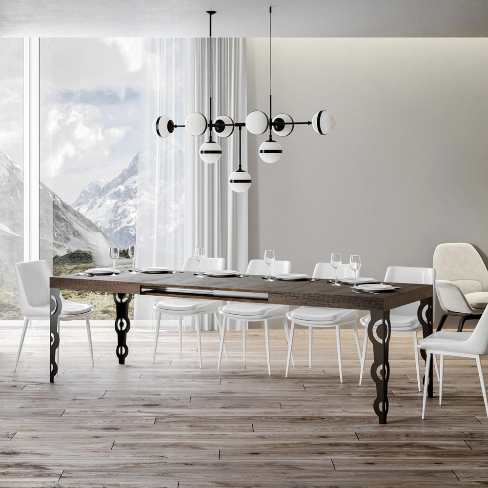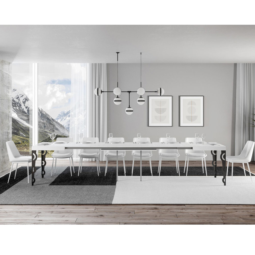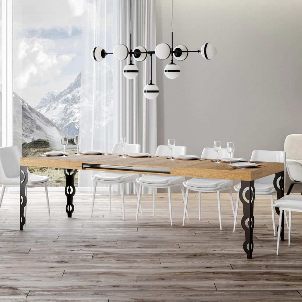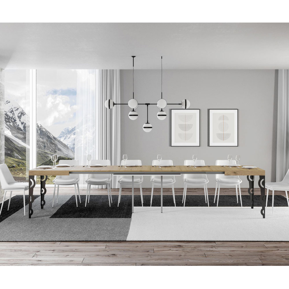 Questo tavolo allungabile fonde l'antico fascino del design ornamentale con la funzionalità moderna. Le gambe scolpite in ferro presentano intricati motivi barocchi, un dettaglio che non mancherà di catturare lo sguardo.