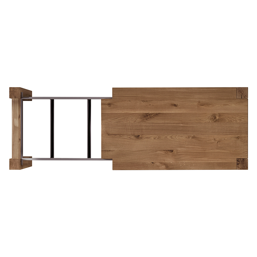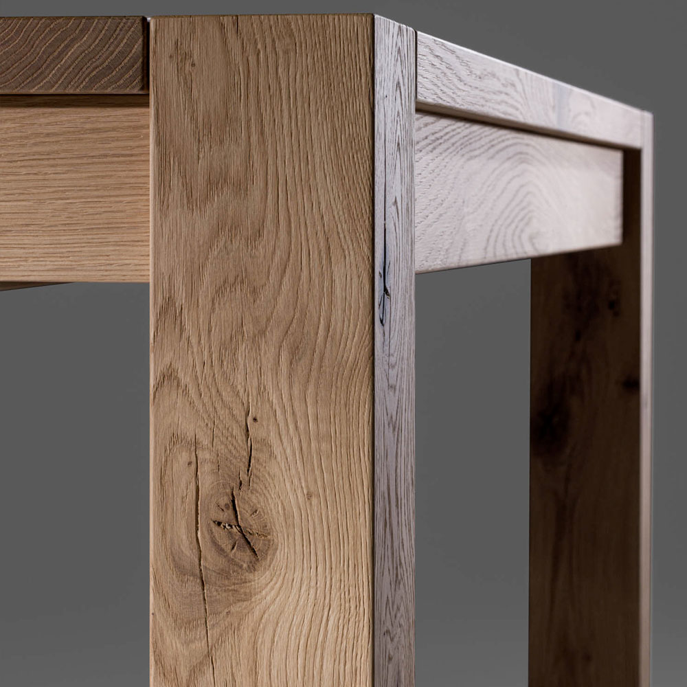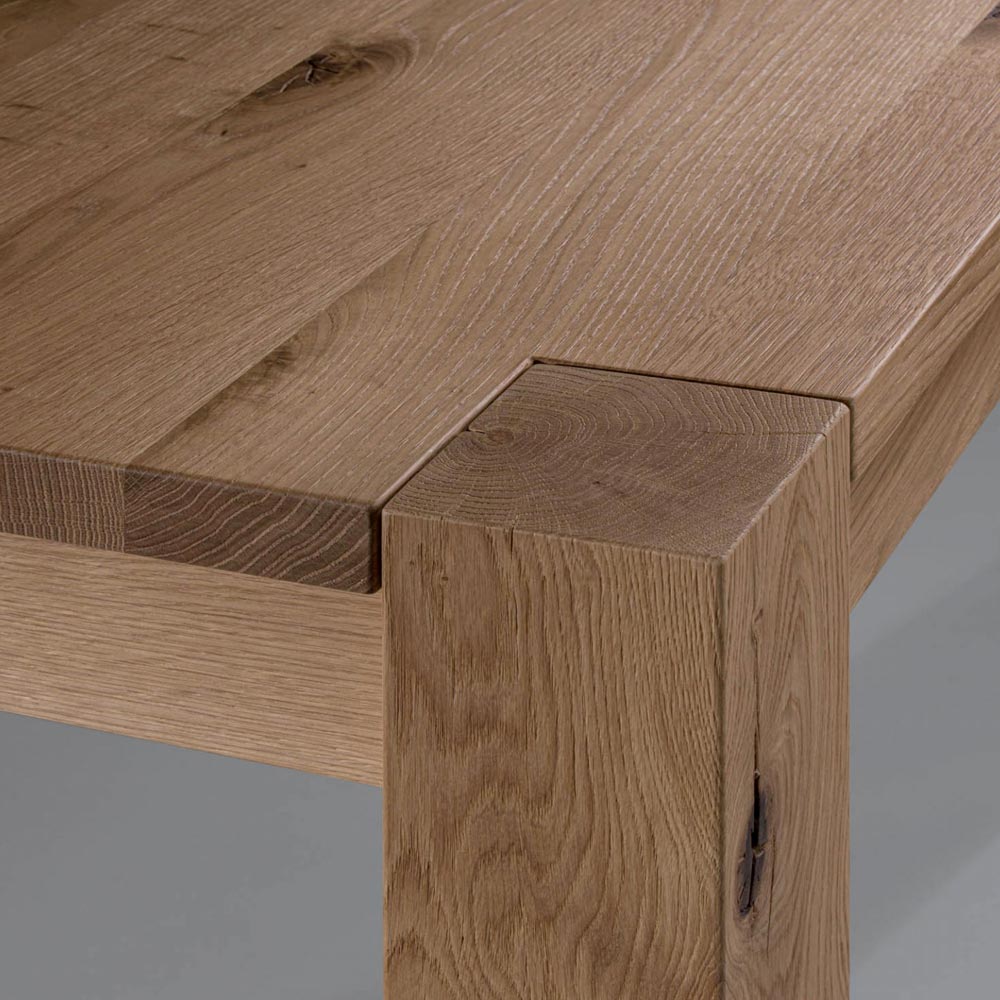 Tavolo allungabile con piano in listellare impiallacciato rovere spaccato naturale e gambe impiallacciate su lamellare, 12x12cm. Le allunghe sono incluse.