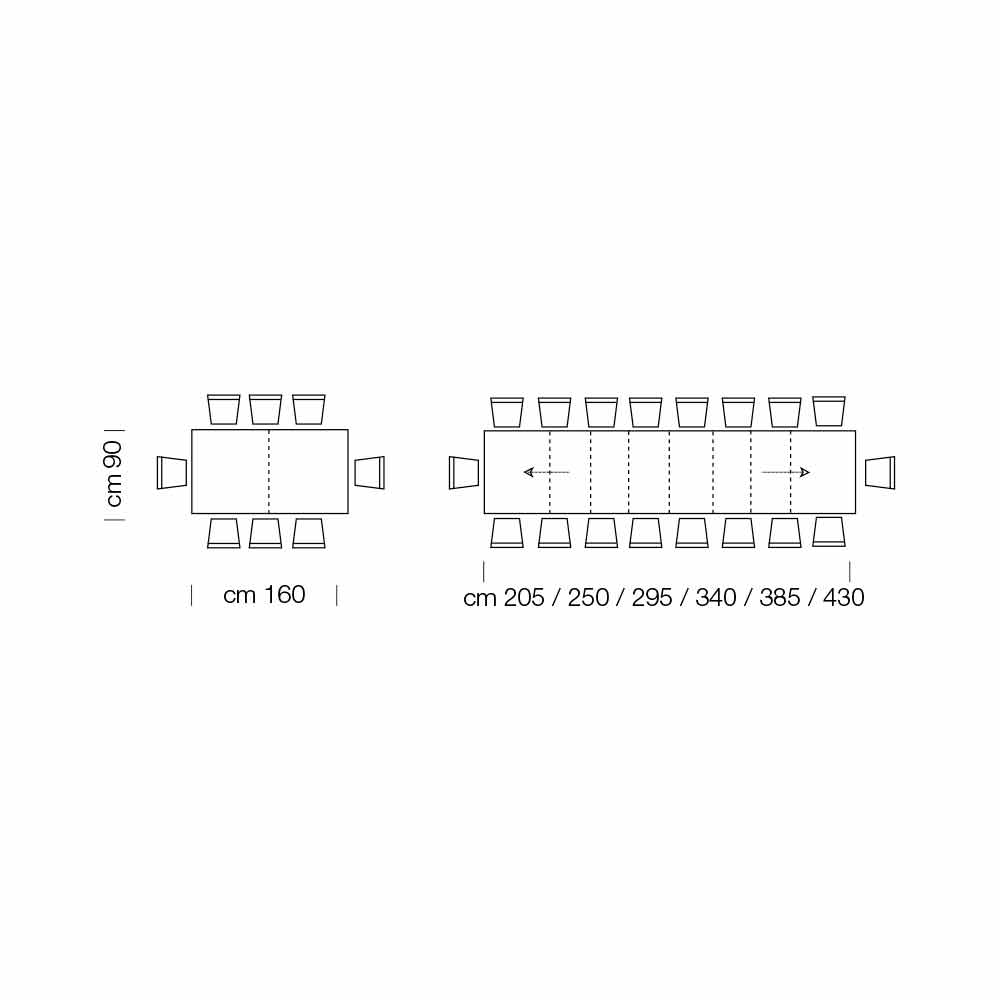 - L 160 (430) x P 90 x H 77 cm 18 posti allungabile con sei allunghe da 45cm, tre interne e tre fornite in una scatola di cartone riutilizzabile;