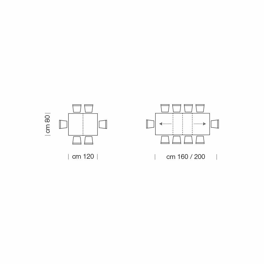 - L 120 (200) x P 80 x H 77 cm 10 posti allungabile con due allunghe da 40cm interne;