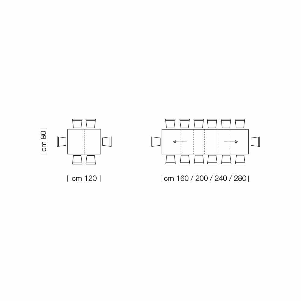 - L 120 (280) x P 80 x H 77 cm 14 posti allungabile con quattro allunghe da 40cm interne;