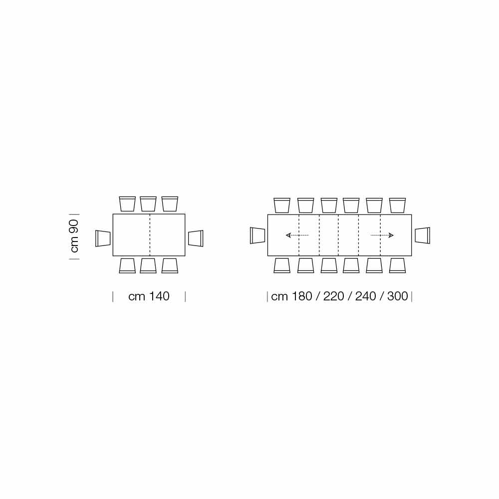 - L 140 (300) x P 90 x H 77 cm 14 posti allungabile con quattro allunghe da 40cm interne;