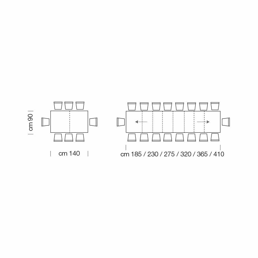 - L 140 (410) x P 90 x H 77 cm 18 posti allungabile con sei allunghe da 45cm, tre interne e tre fornite in una scatola di cartone riutilizzabile;