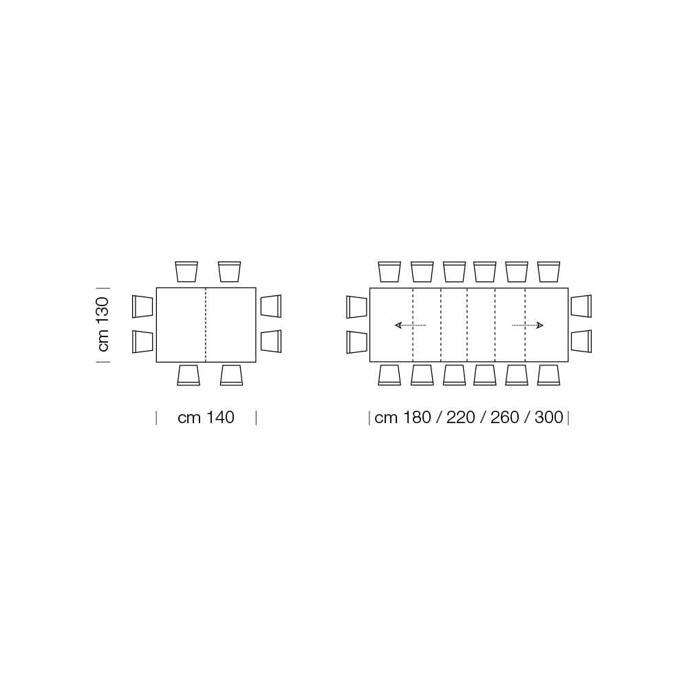 - L 140 (300) x P 130 x H 77 cm 16 posti allungabile con quattro allunghe da 40cm interne;