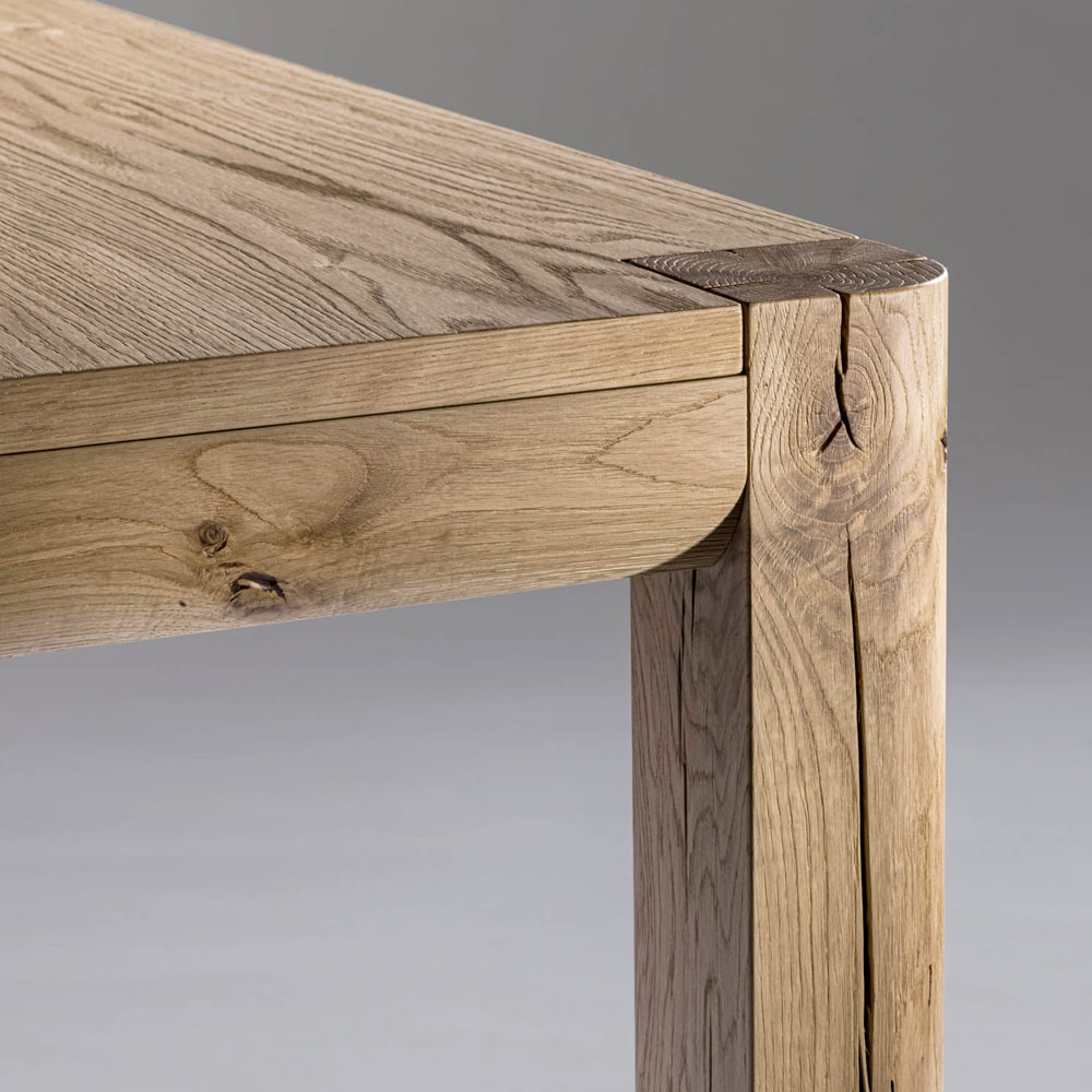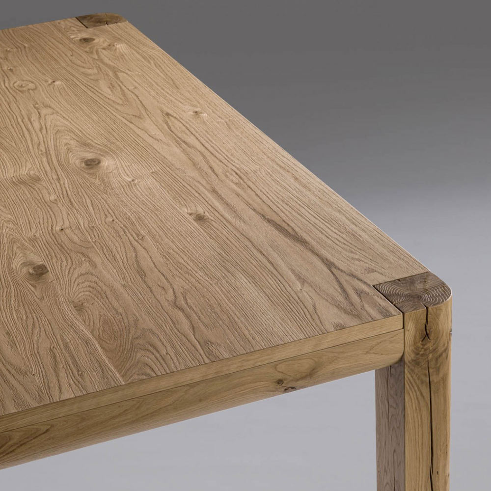 Tavolo allungabile con piano in listellare impiallacciato quercia naturale e gambe quadrotto in massello con crepe e nodi 12x12cm. Dimensioni H 77 cm, spessore 3 cm.