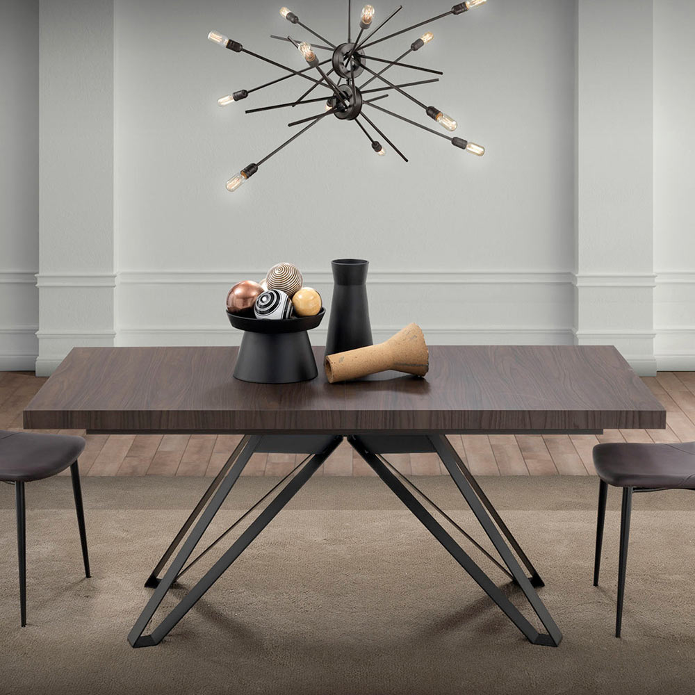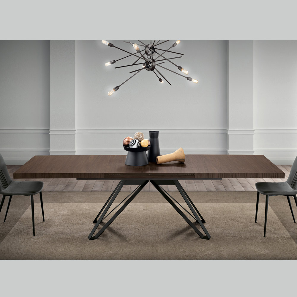 Le gambe, in metallo nero a forma di A rovesciata, si distinguono per la loro struttura geometrica e per la finitura opaca, un esempio di come funzionalità e stile possano essere armoniosamente fusi. Il design permette di estendere facilmente il tavolo, assicurando che sia adatto tanto per un uso quotidiano quanto per ospitare occasioni speciali.