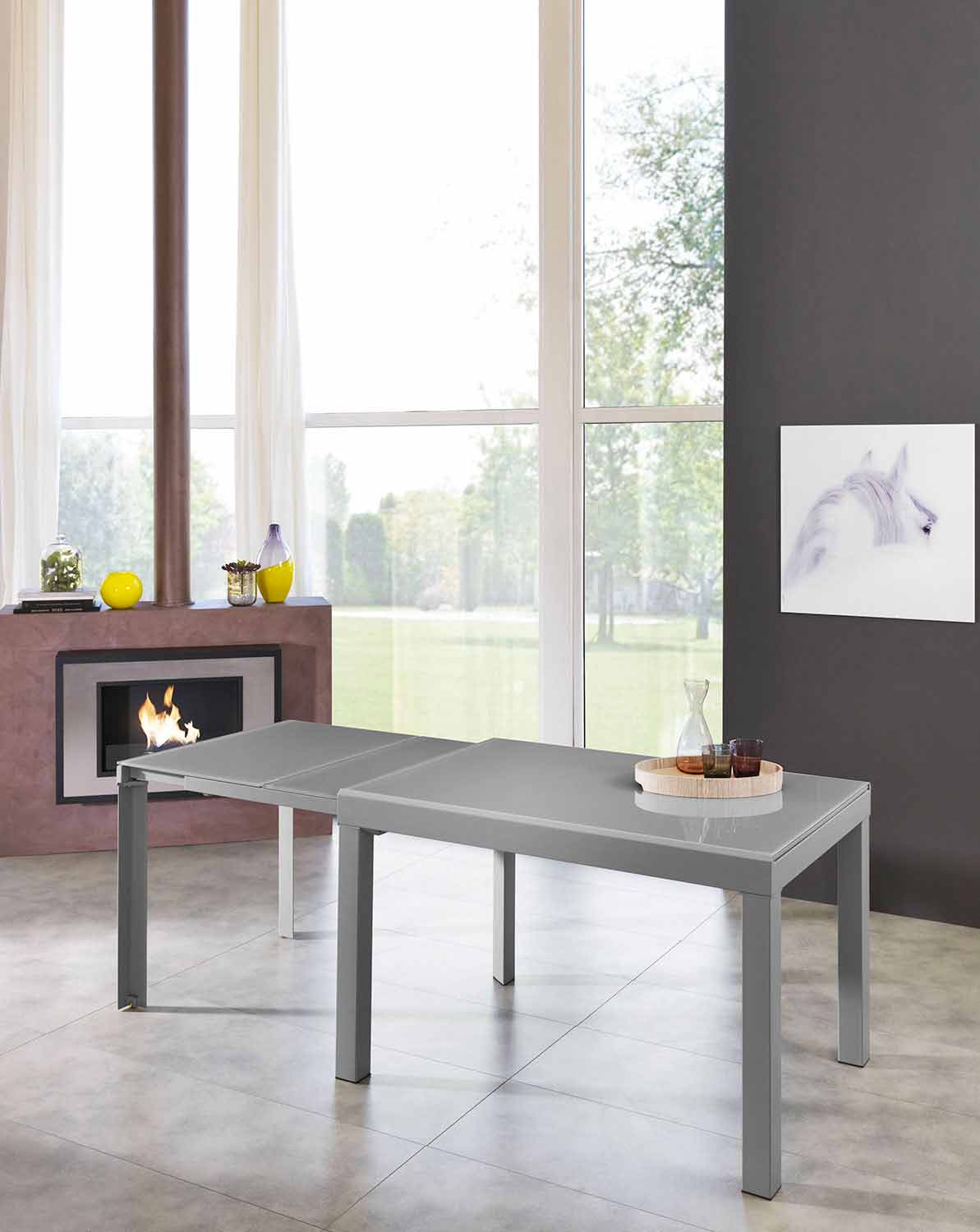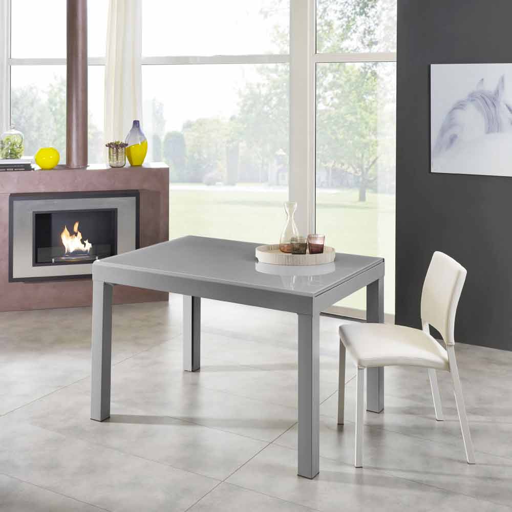 Il tavolo è realizzato con struttura in metallo verniciato grigio e piano in vetro temperato e melaminico dello stesso colore così come le allunghe interne, anch'esse in vetro temperato grigio.