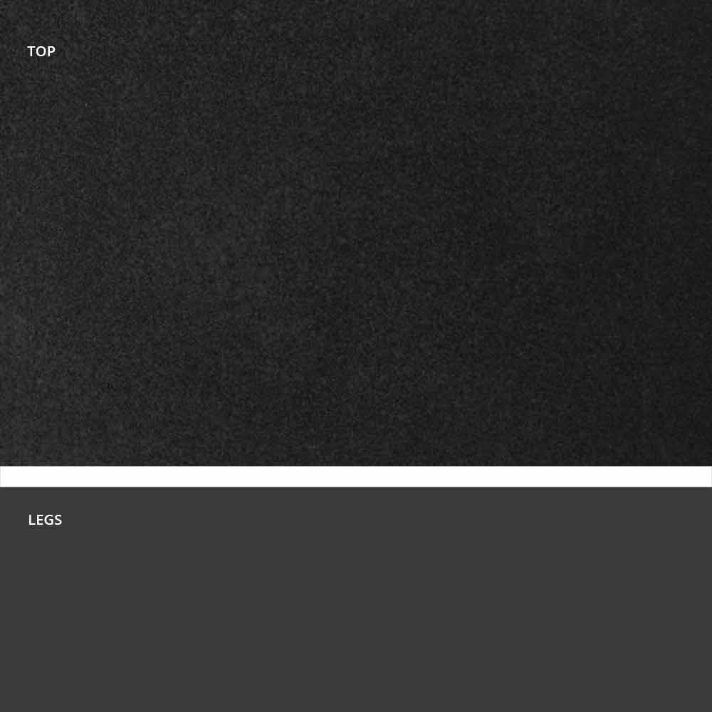 - base in metallo grigio nero (RAL 7021) e piano in gres in finitura smoke.