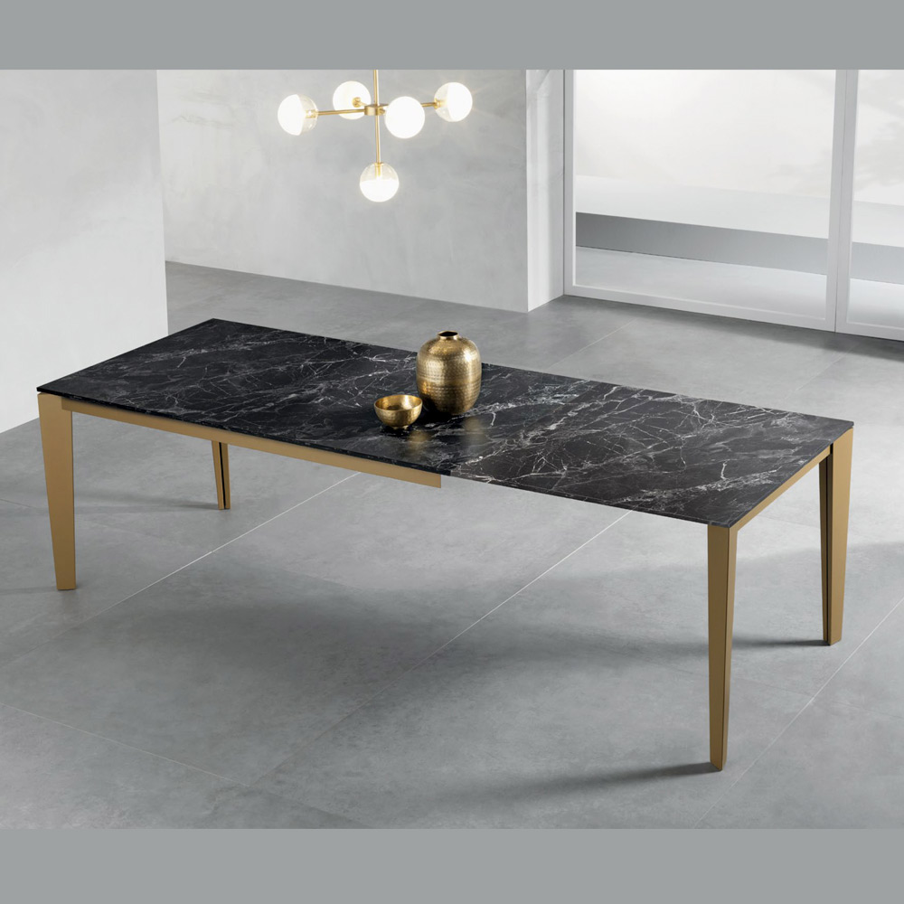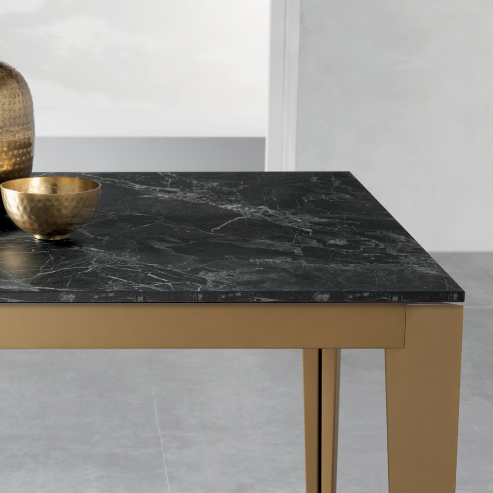 Elegante e funzionale, questo tavolo rettangolare allungabile unisce design moderno e praticità. Il piano in laminato effetto marmo dark (spessore 18 mm) mette in risalto le venature calde e autentiche del marmo, mentre le gambe oro invecchiato in metallo verniciato conferiscono stabilità e un tocco contemporaneo.