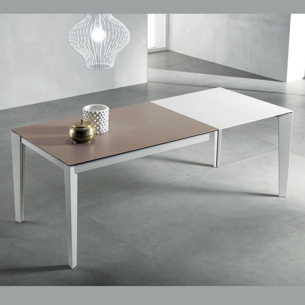 Elegante e funzionale, questo tavolo rettangolare allungabile unisce design moderno e praticità. Ha il piano in vetroceramica finitura fokos terra (spessore 10/11 mm), mentre le gambe bianco opaco in metallo verniciato conferiscono stabilità e un tocco contemporaneo.