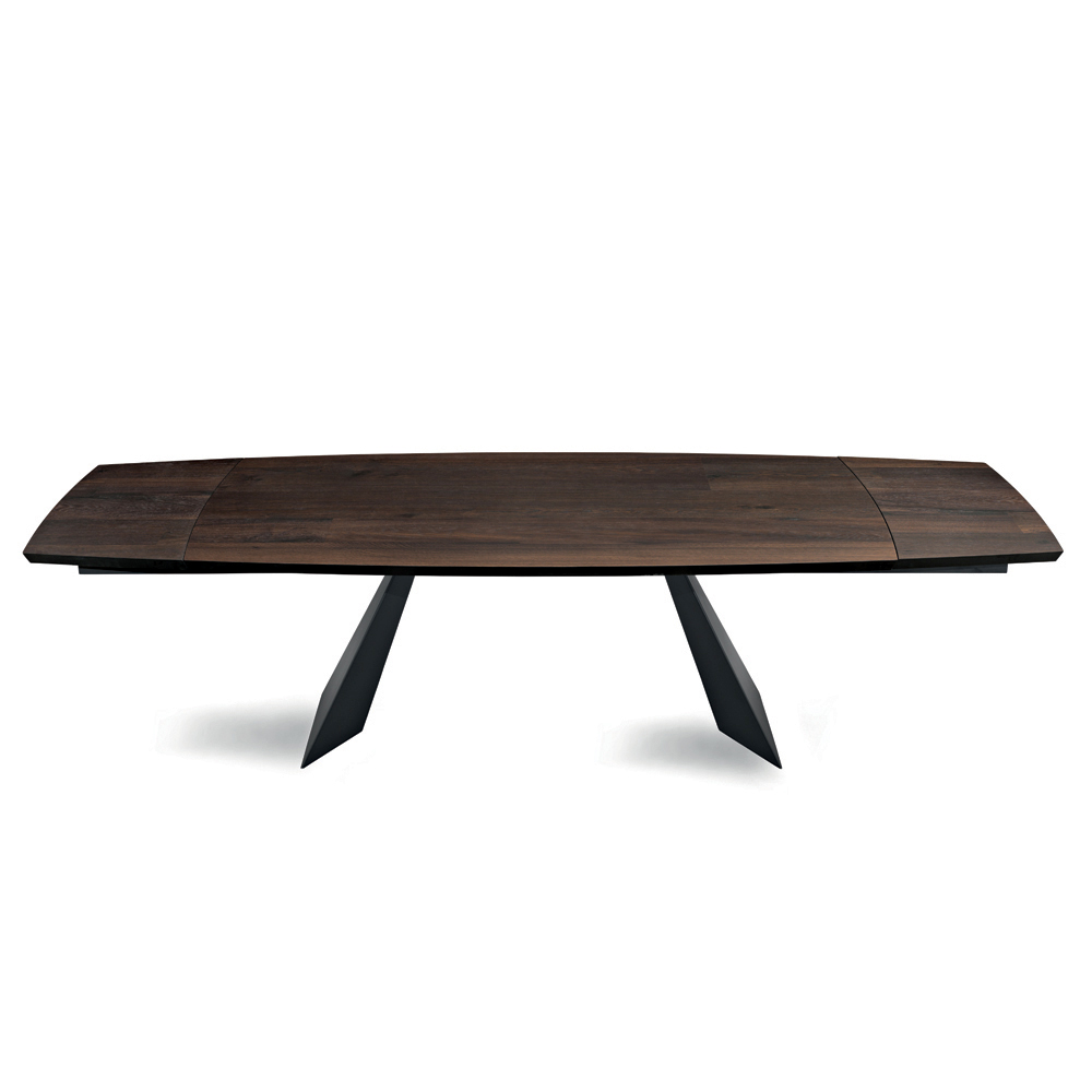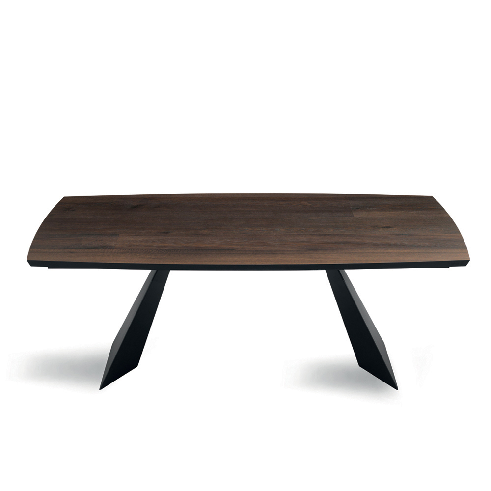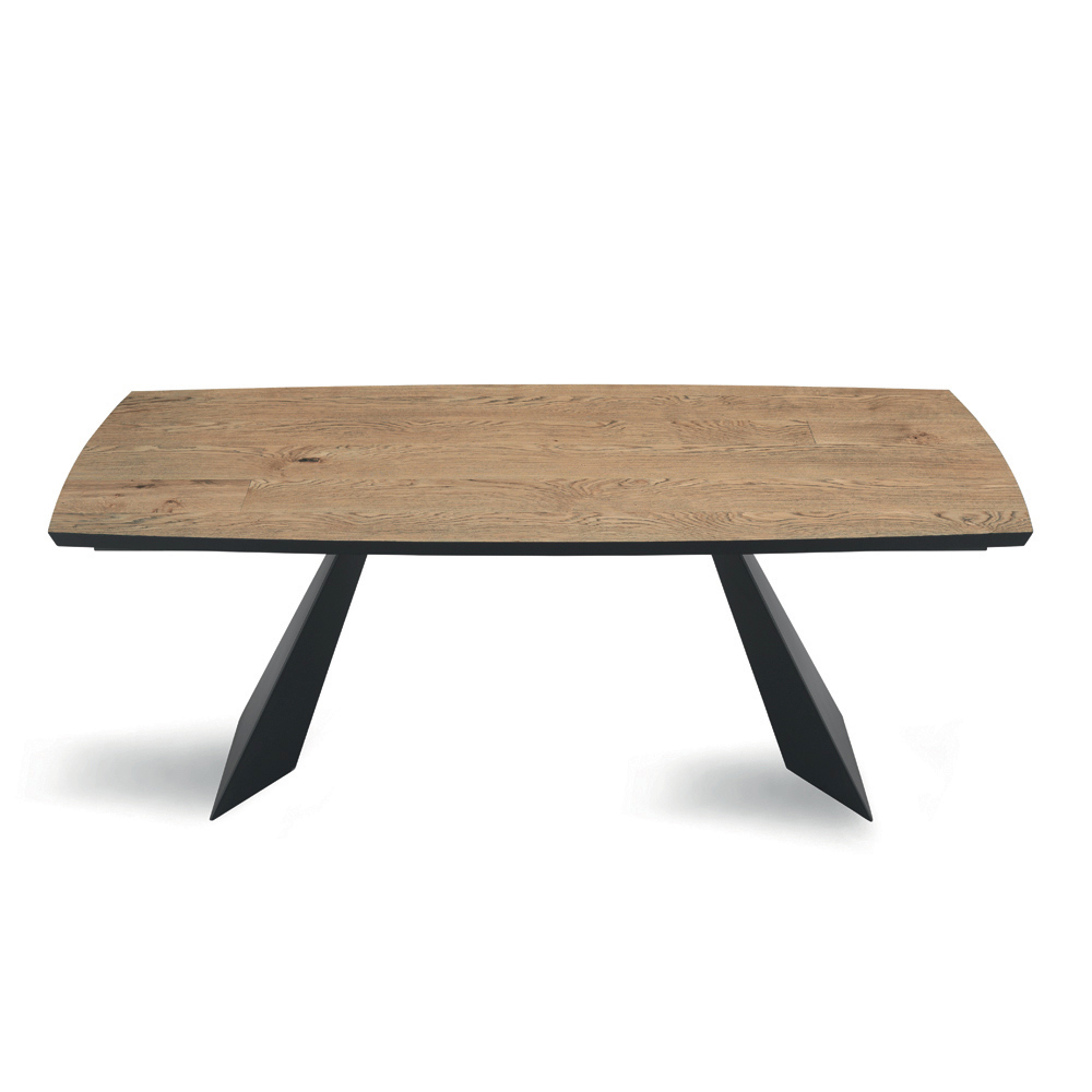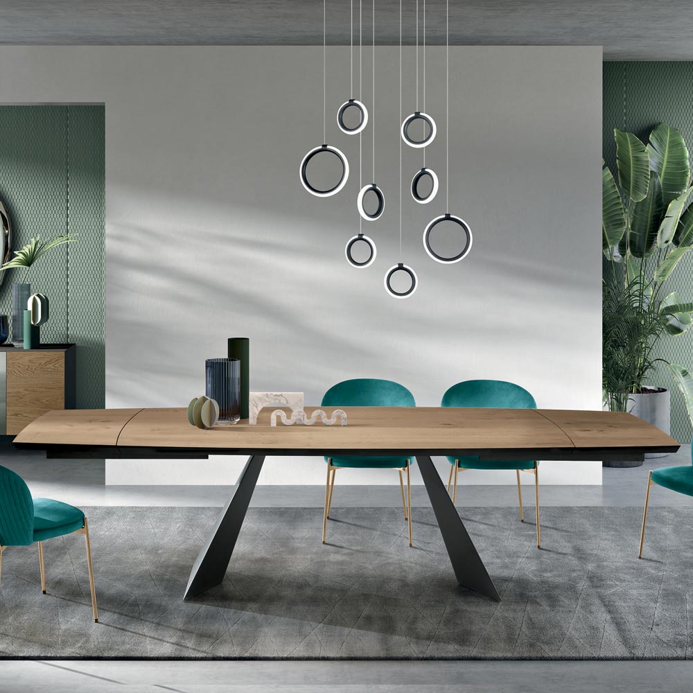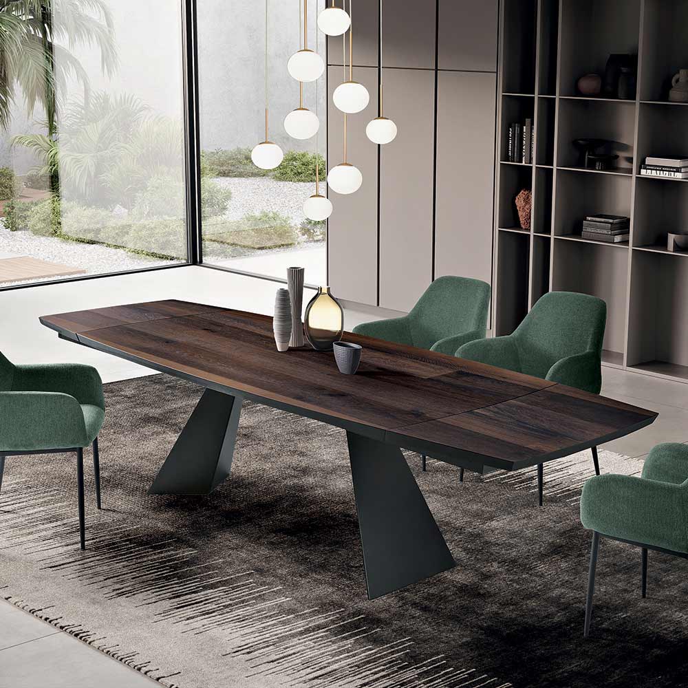 La combinazione tra il metallo e il legno crea un contrasto elegante e contemporaneo, rendendo il tavolo adatto a diversi stili di arredamento. Il piano è disponibile nelle finiture rovere crudo e rovere termico, pensate per valorizzare la naturale bellezza del legno e integrarsi facilmente in ambienti moderni.