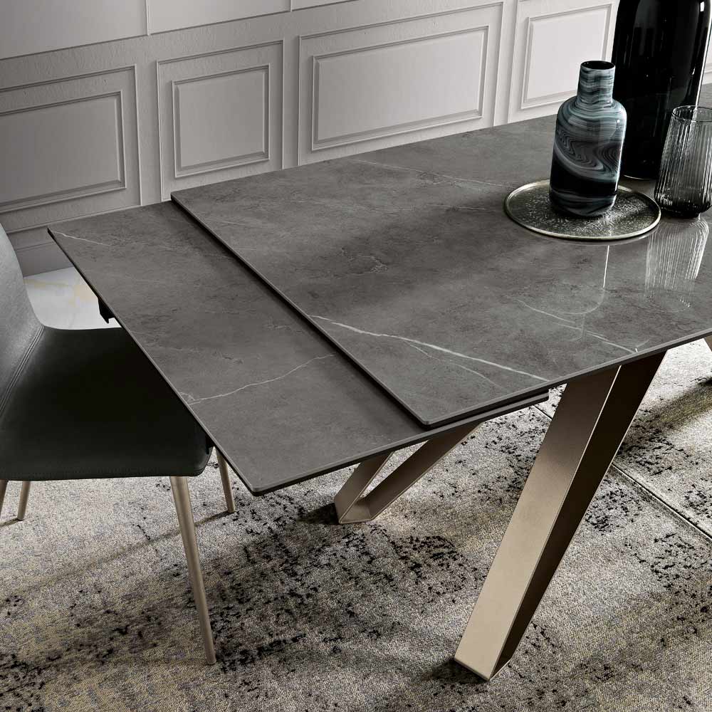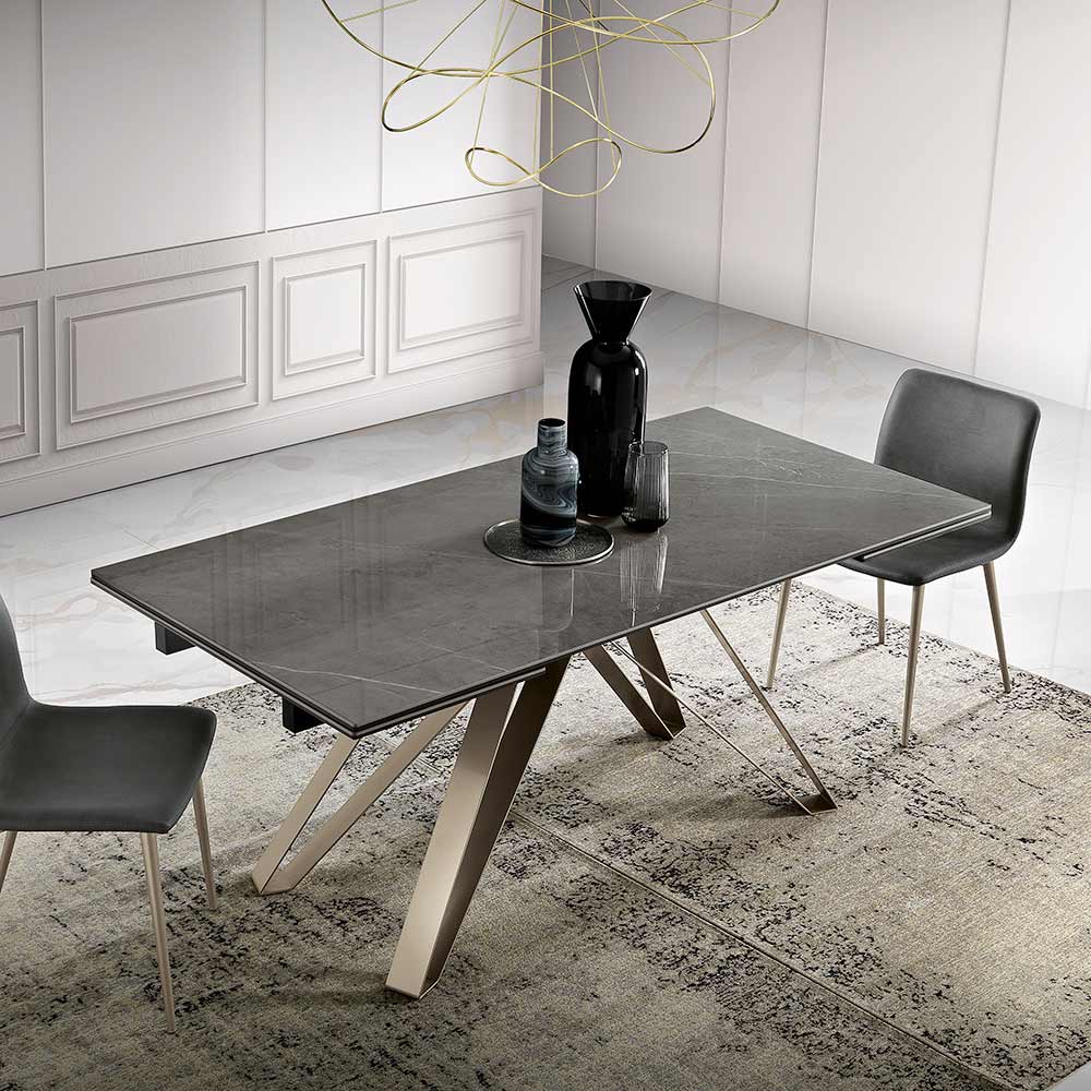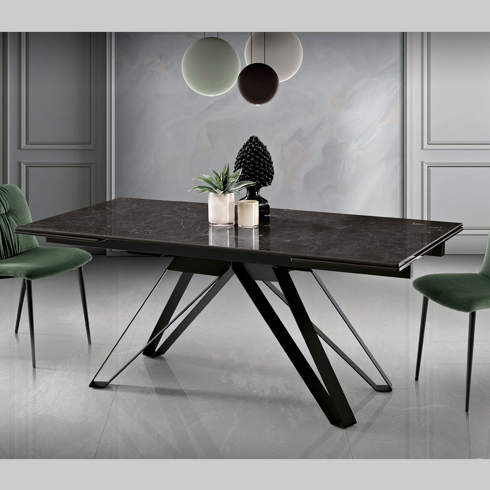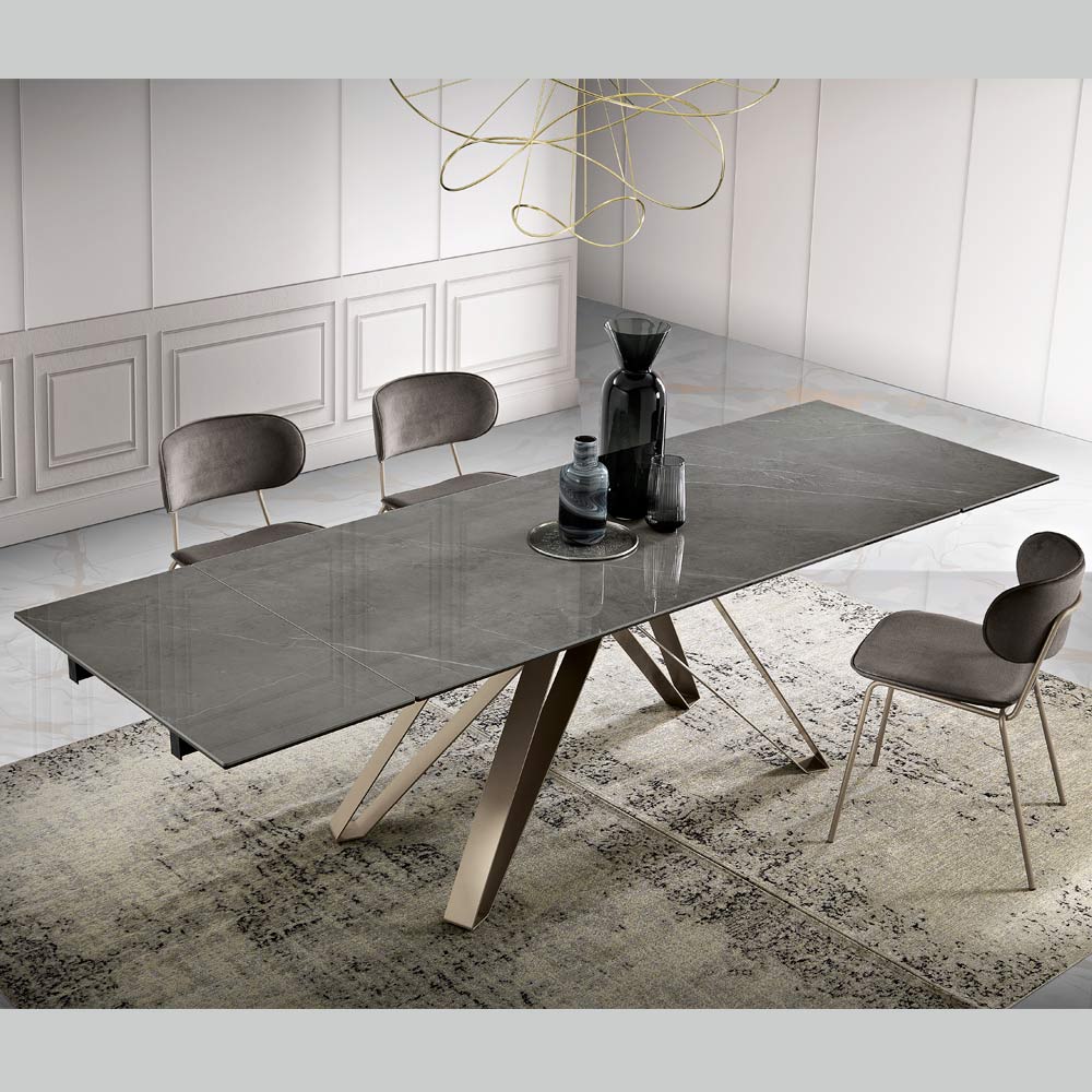 Immerso in una palette di coloro sofisticata, questo tavolo allungabile è l'esempio dell'eleganza contemporanea. Il piano in vetroceramica è un trionfo estetico, una tela naturale su cui si disegnano venature che aggiungono profondità e movimento alla superficie.