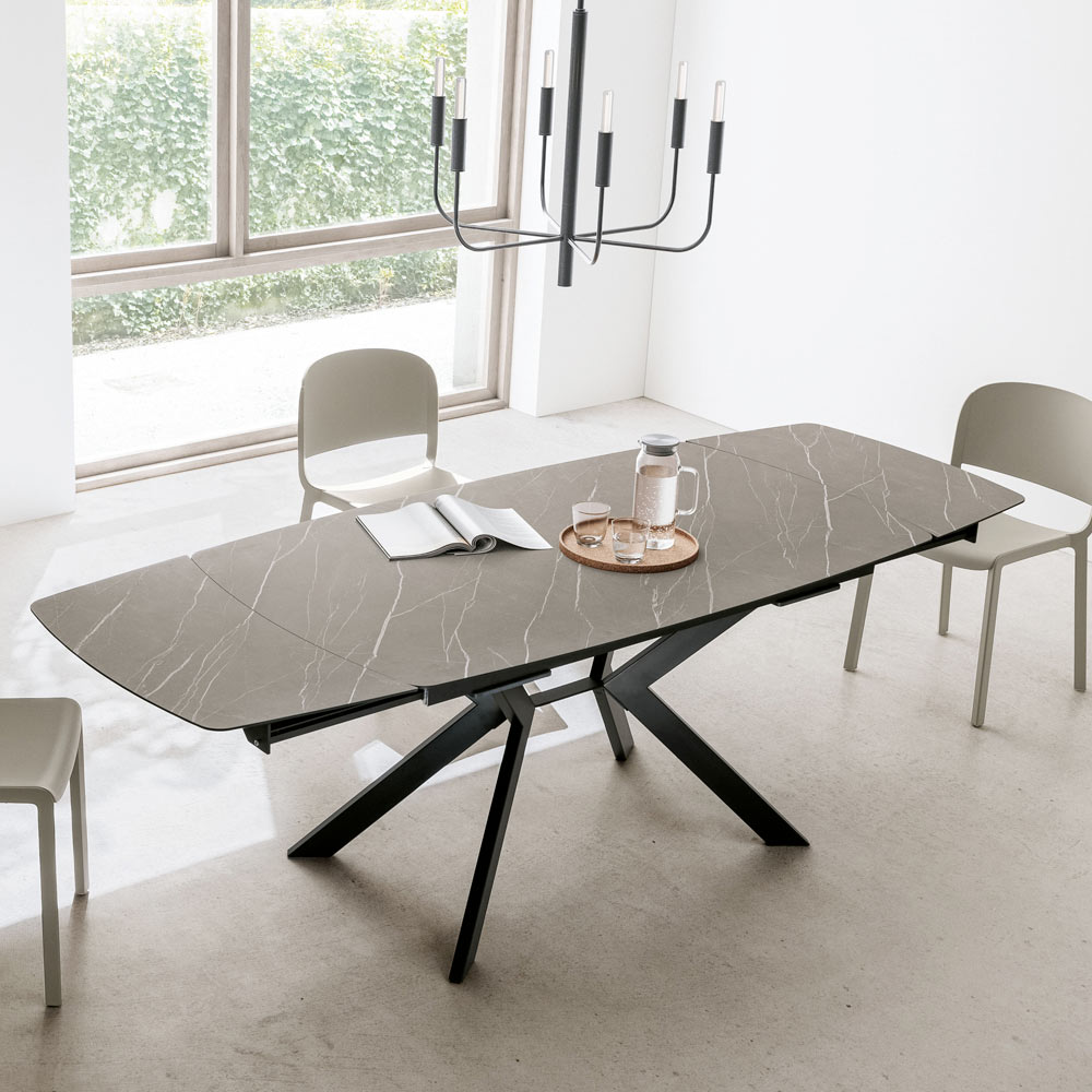 Eleganza e praticità si fondono in questo tavolo allungabile in HPL e metallo, pensato per chi desidera un arredo di forte impatto visivo, ma estremamente funzionale.