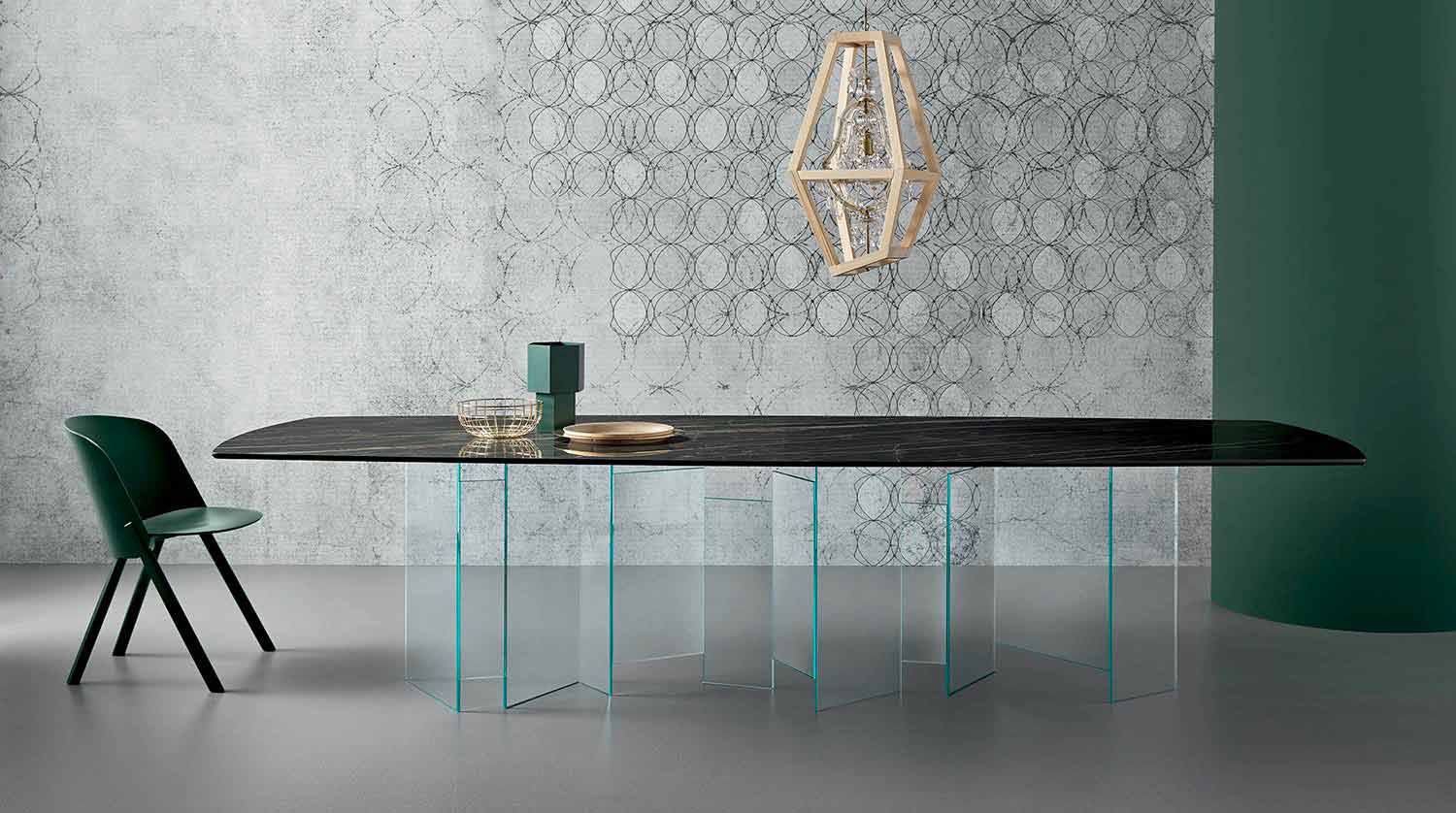 Tavolo di design moderno con piano in ceramica e base in vetro extrachiaro, prodotto in Italia.