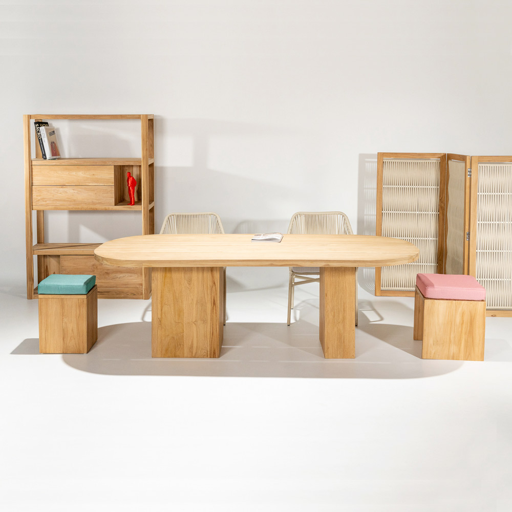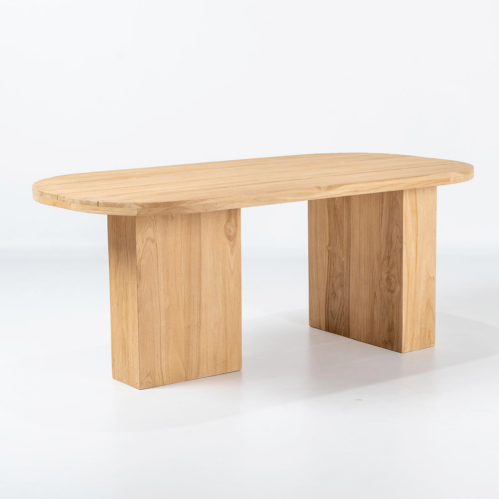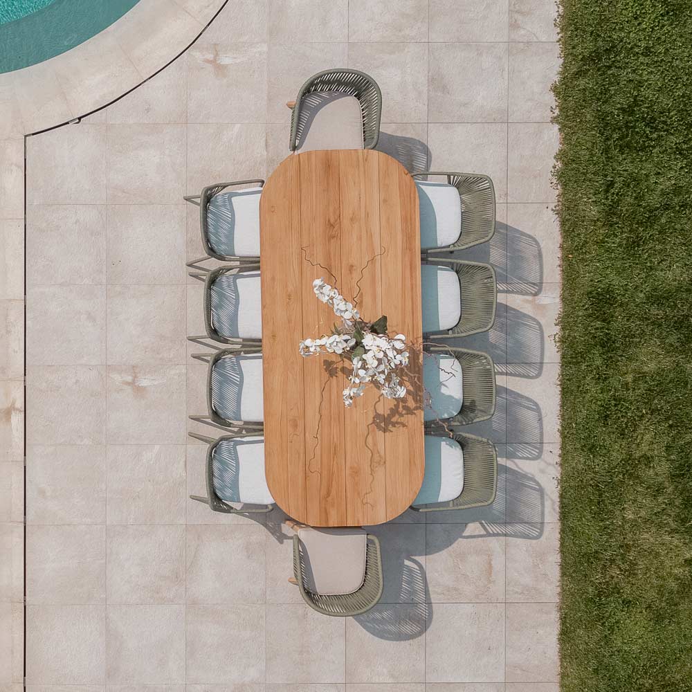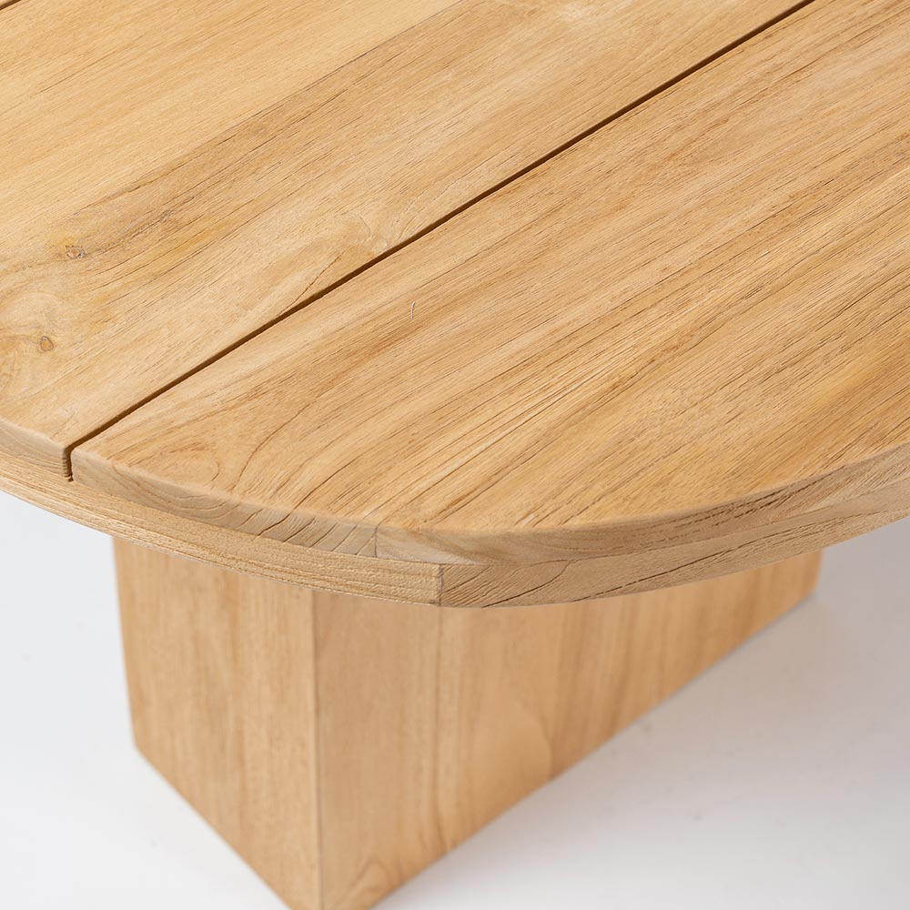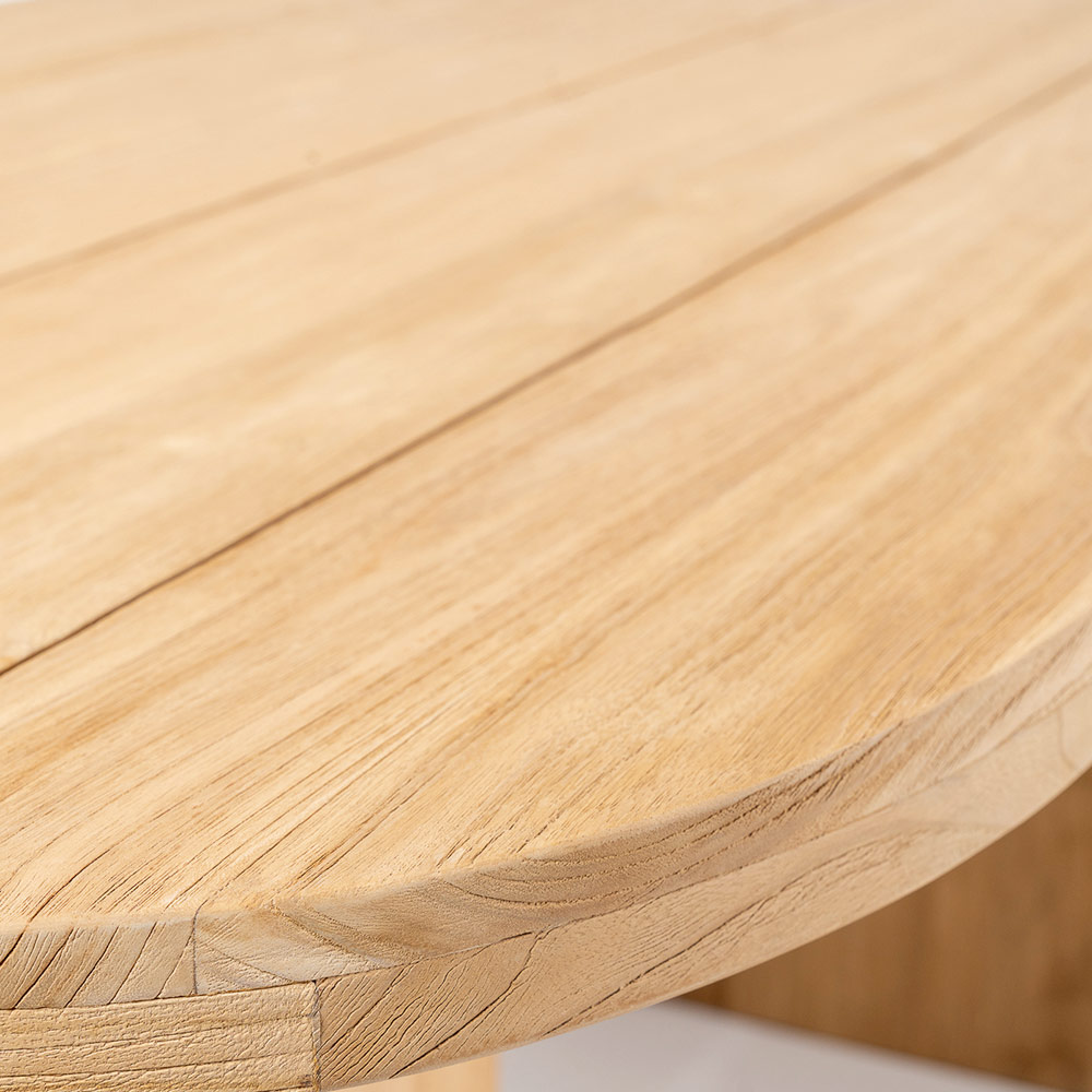 Tavolo con piano in teak spazzolato ad assi longitudinali, con angoli stondati.