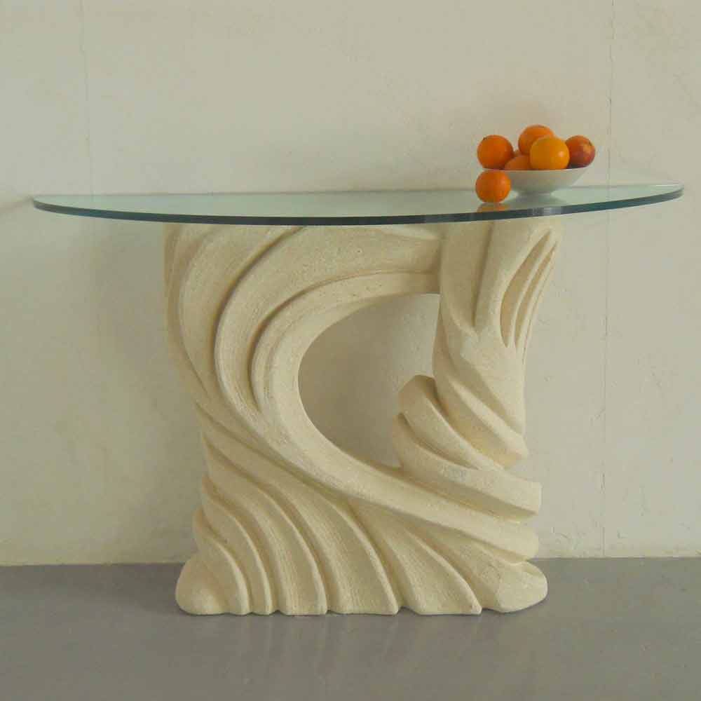 Tavolo consolle Made in Italy con basamento in pietra naturale di Vicenza, scolpito manualmente dal blocco massello e con piano in cristallo float dallo spessore di 15 mm, sagomato mezzo ellittico, in appoggio sulla base.