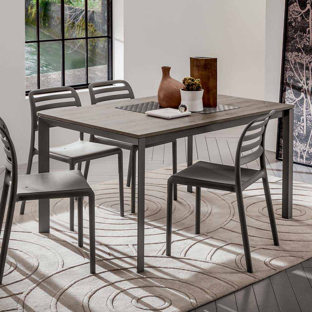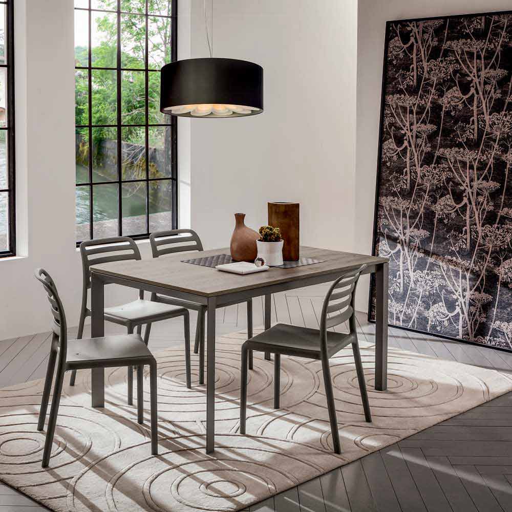 Tavolo da pranzo con piano in melaminico e struttura in metallo Made in Italy.