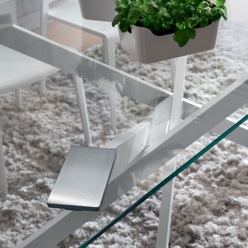 Tavolo da pranzo con piano in vetro trasparente realizzato in Italia, di lusso.